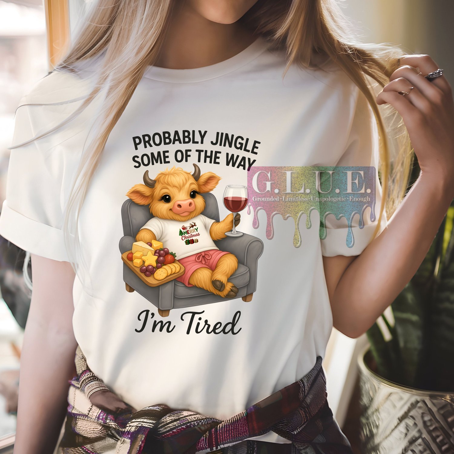 Holiday Highland Cow “I’m Tired” PNG | Charcuterie Wine Cow Christmas | Funny Exhausted Christmas Shirt Design