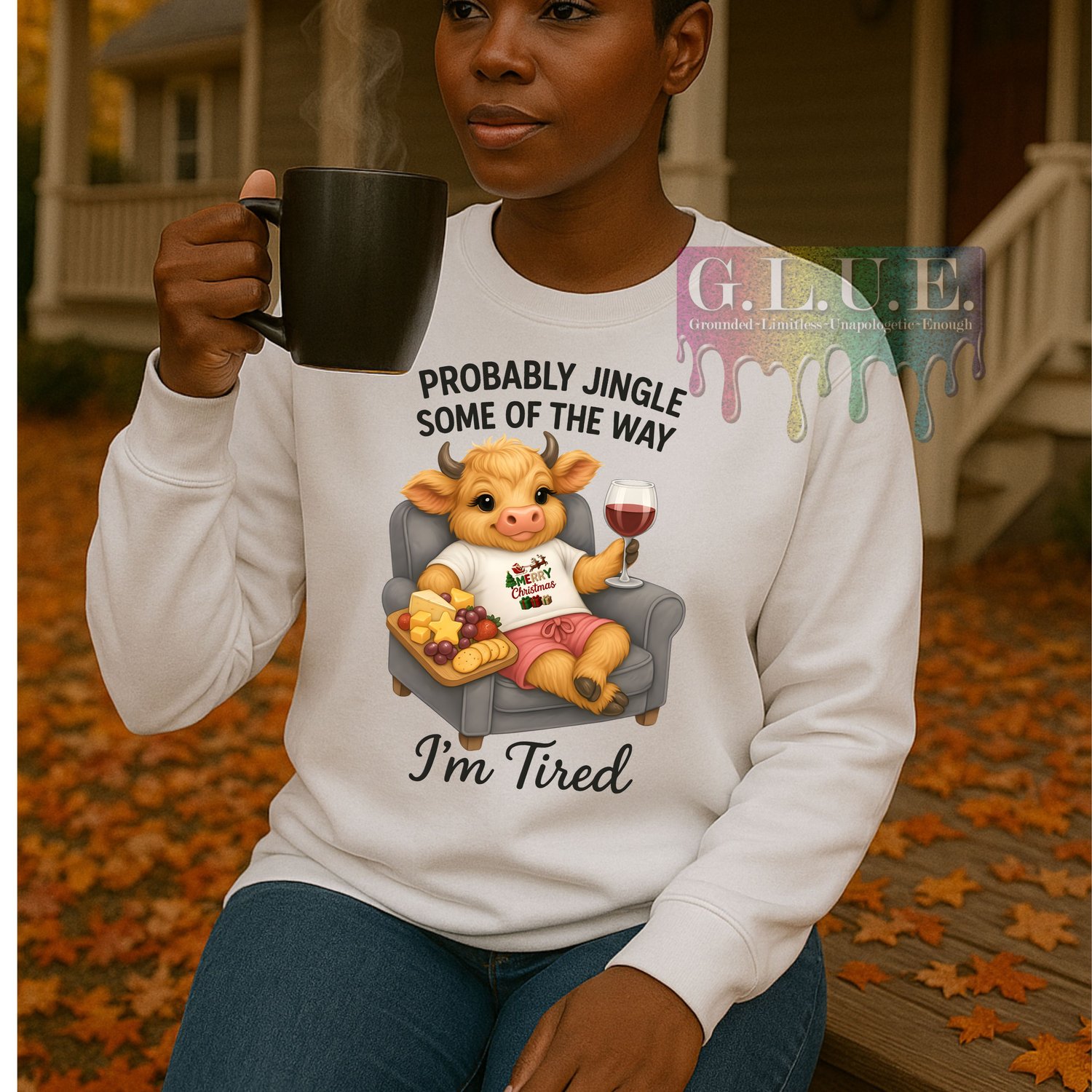 A fluffy, cozy cow lounging in her chair with a charcuterie board and wine… because sometimes we only “jingle some of the way,” and that’s ENOUGH.