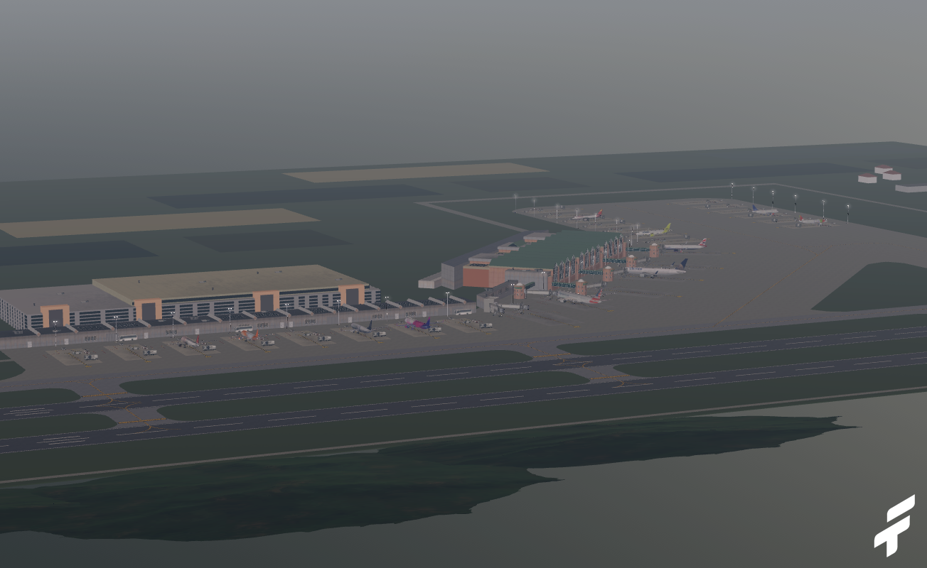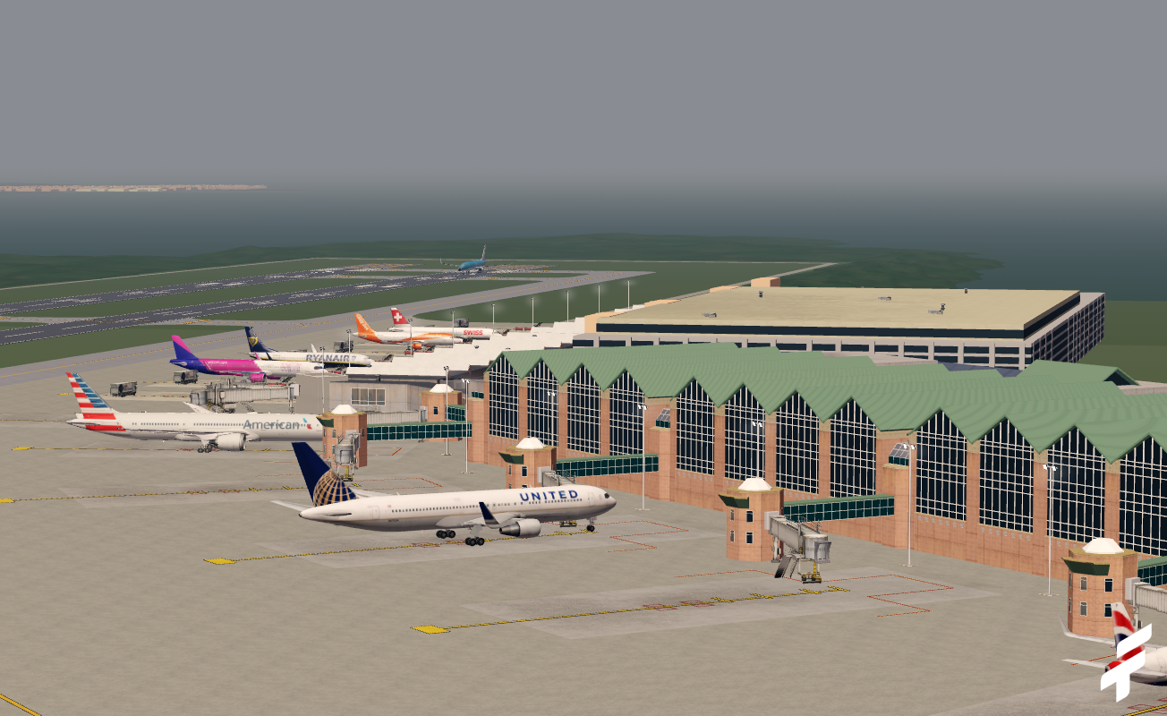 -High-quality static terminal with static mesh aircraft, jetways, and ground equipment.