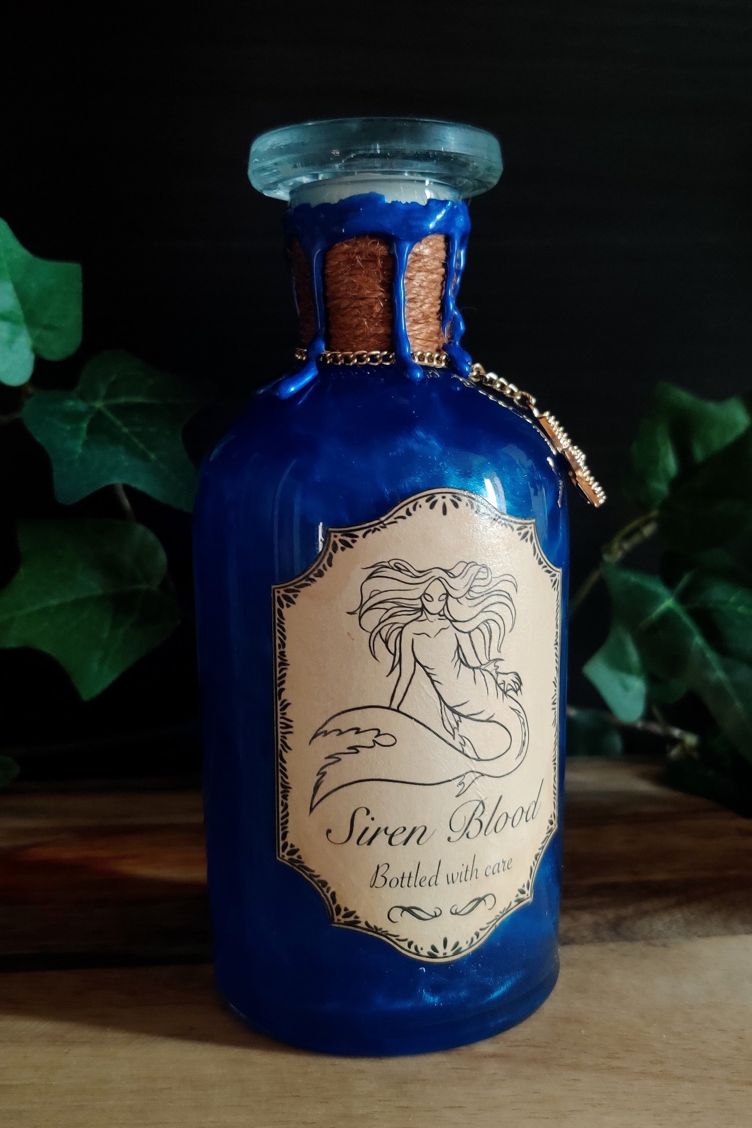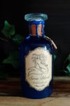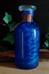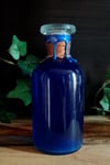 Pullossa on syvän sinistä nestettä ja se on koristeltu käsintehdyllä etiketillä ja juuttinarulla.