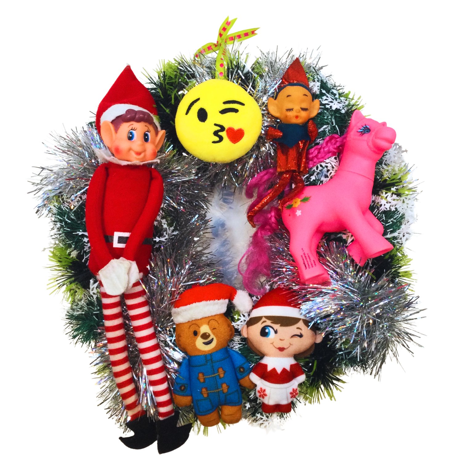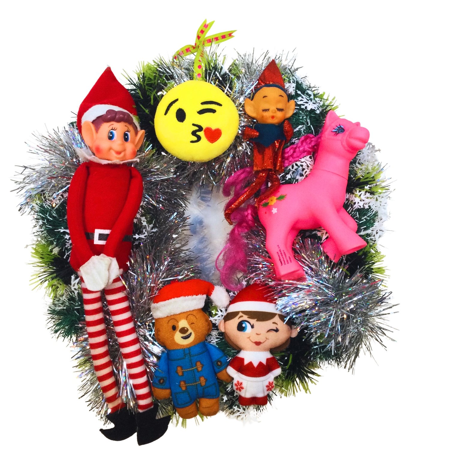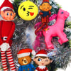 Zhuzh up your front door, party area, or home with this unique and upcycled bold decorative wreath. Featuring cheeky elves and bright smilie plushies, it will banish the winter blues!