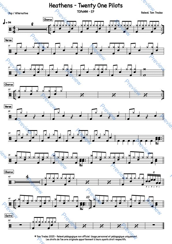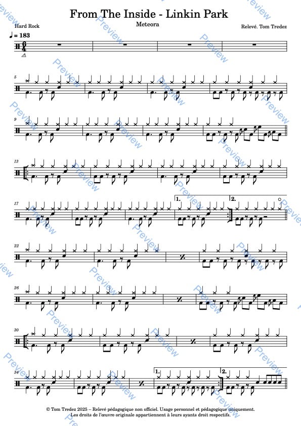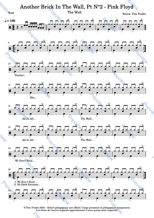 Partition complète de Another Brick In The Wall, pt N°2 - Pink Floyd, réarrangée pour la batterie, reprenant à l'identique la version de l'album.