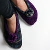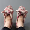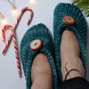 The unstretched finished foot length of these slippers is 6½ (7¼, 7¾, 8¼ )”/ 16.5 (18.5, 19.5, 21)cm. XS, S, M, and L sizes stretch to fit women’s US shoe sizes 4-5, 6-7, 8-9, 10-11. Shown in Size S.