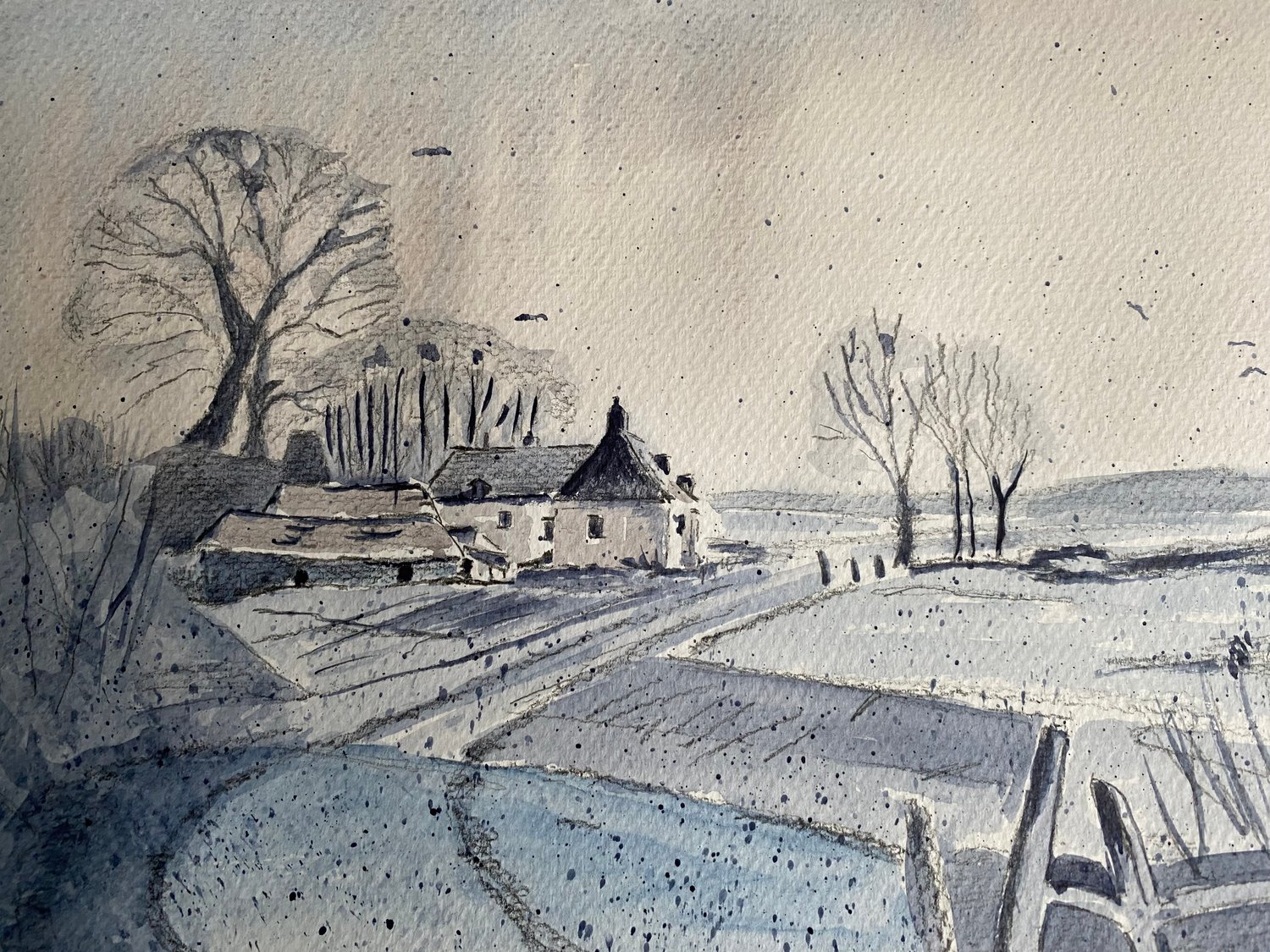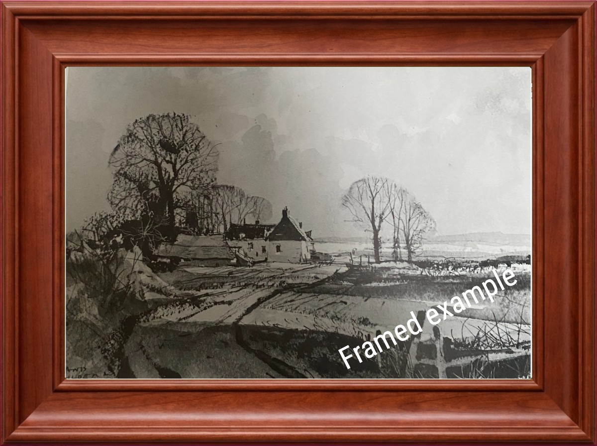 This atmospheric artwork was produced with a very limited palette to convey a winter scene of weak light and moody weather, with an isolated farm standing in the distance.