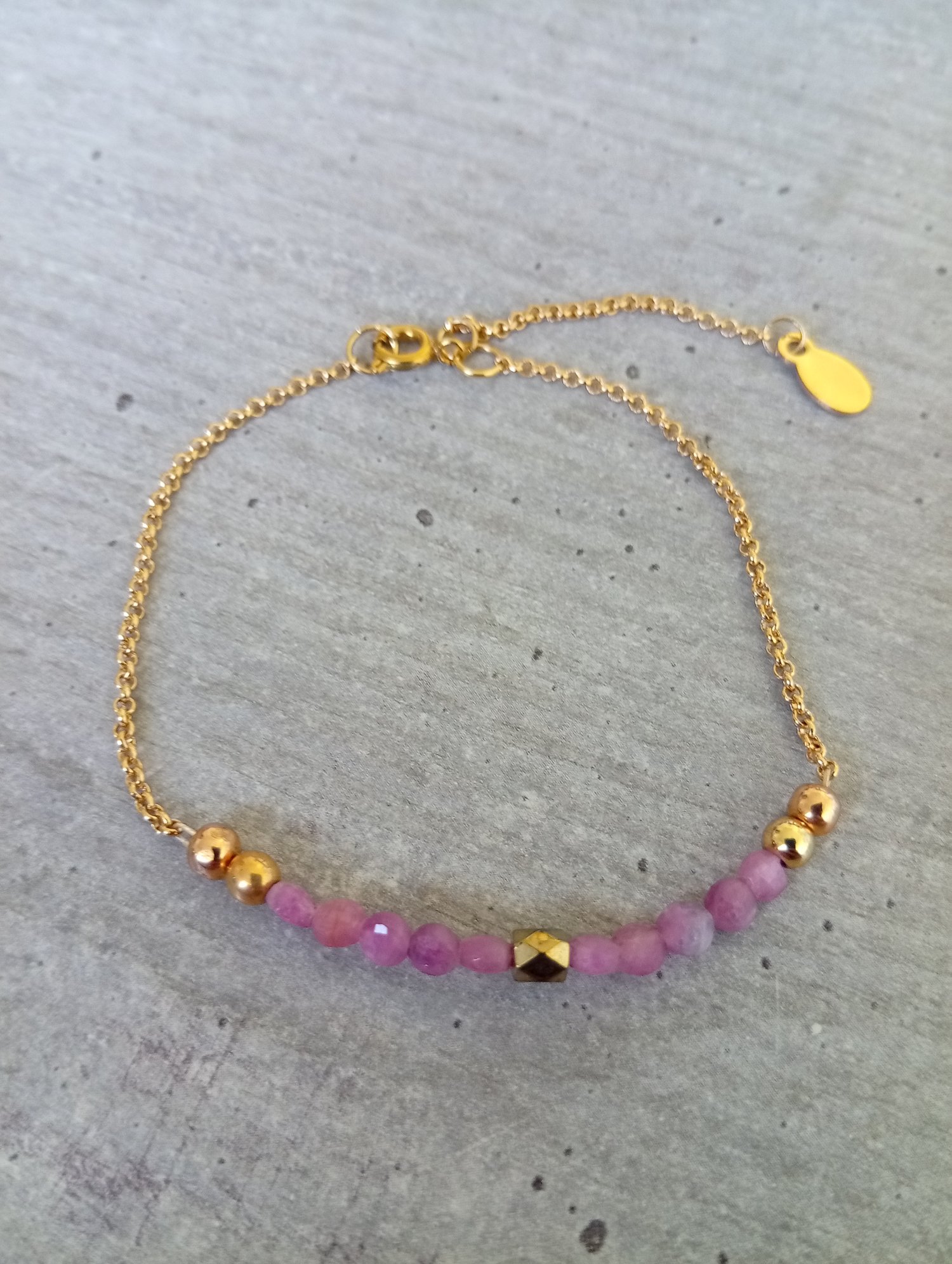 Bracelet en chaîne dorée orné de perles de rubis facettées. Une création lumineuse et intense, porteuse d’élan vital, de passion et de force intérieure.