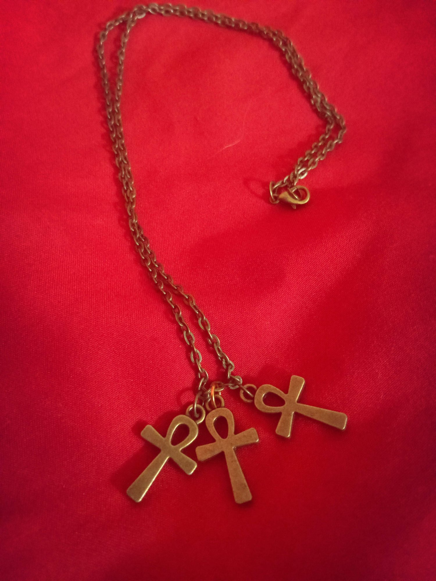 Bronze Triple Ankh Charm Necklace. This handcrafted piece features three powerful ankh charms on a durable bronze chain, symbolizing eternal life, spiritual balance, and the sacred unity of mind, body, and soul.