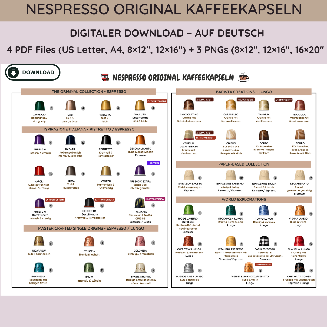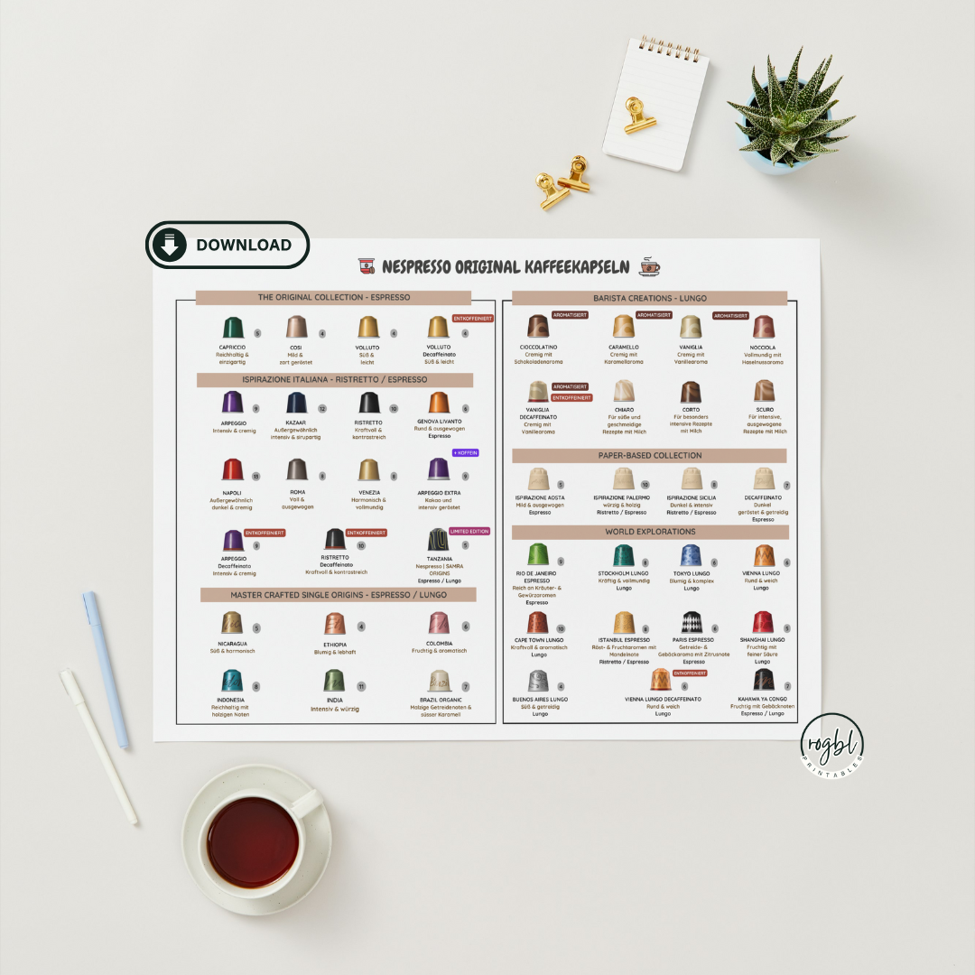 Dieser druckbare Nespresso Kaffeekapsel-Guide ist ein unverzichtbares Hilfsmittel für alle Kaffeeliebhaber, die Wert auf Komfort und Qualität legen.