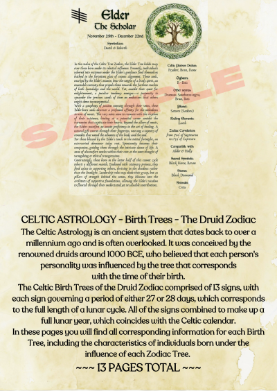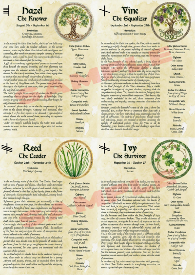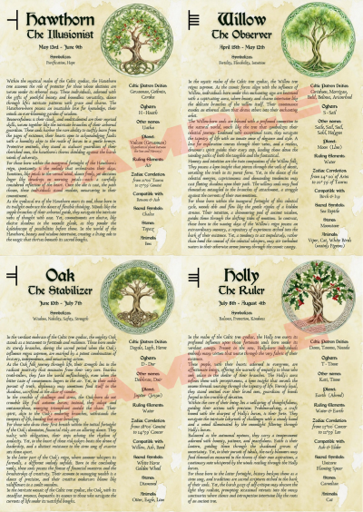 The Celtic Birth Trees of the Druid Zodiac comprised of 13 signs, with each sign governing a period of either 27 or 28 days, which corresponds to the full length of a lunar cycle. All of the signs combined to make up a full lunar year, which coincides with the Celtic calendar.