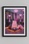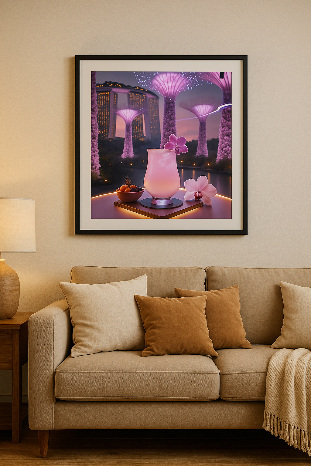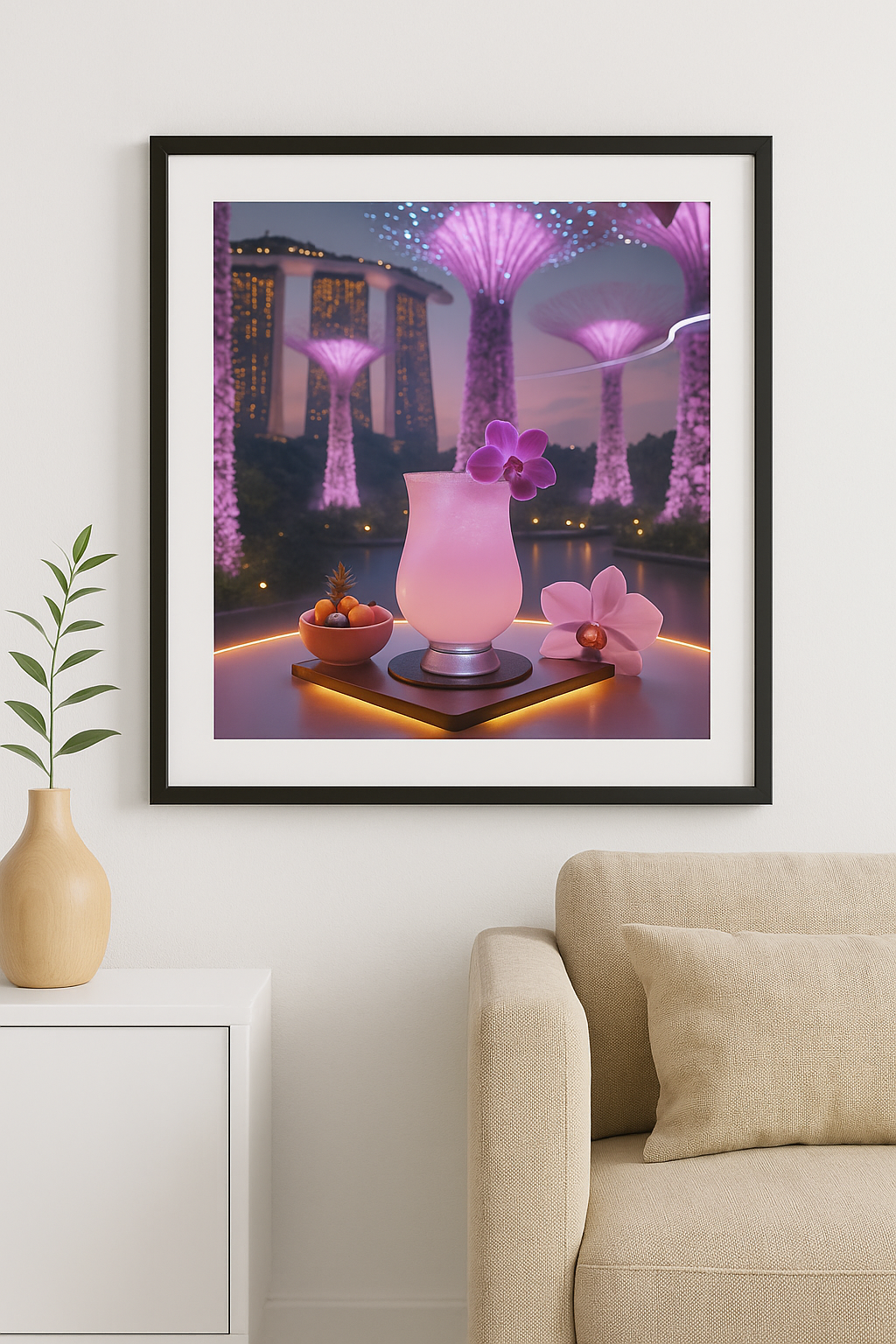 A dreamy twilight artwork of Singapore’s Supertrees at Gardens by the Bay, paired with a glowing pastel pink cocktail and orchid bloom. The soft pink and purple tones create a romantic, elegant mood — perfect for wall art, gifts, or anyone longing for the Lion City.