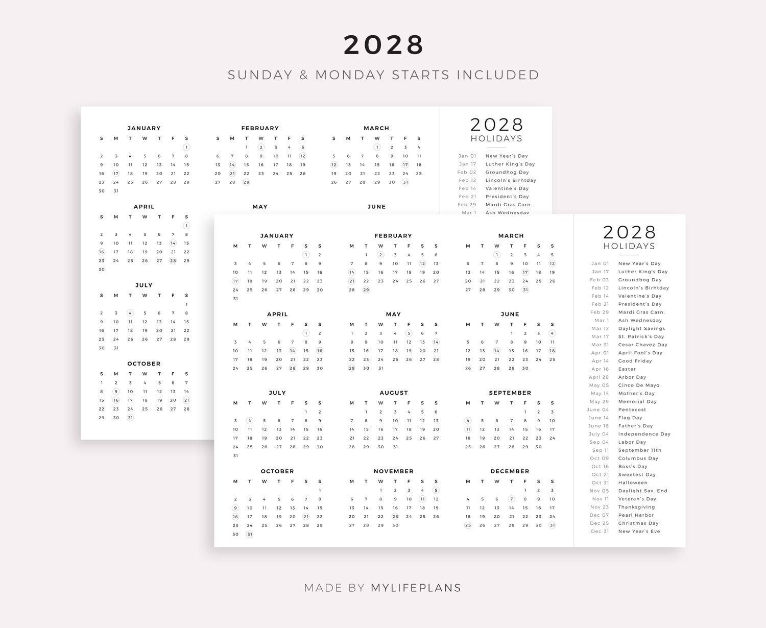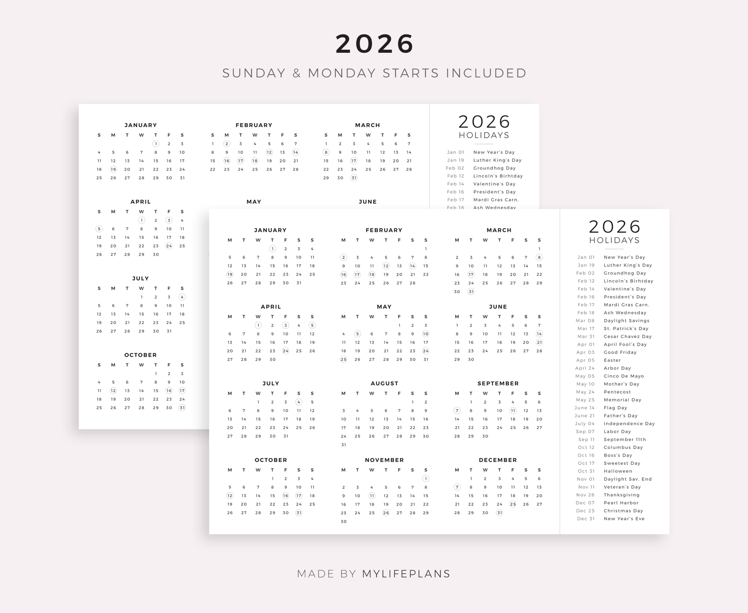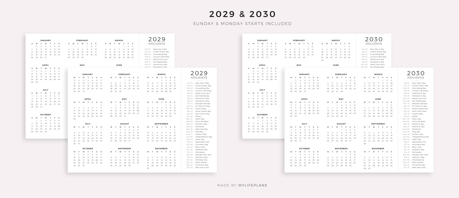 These are printable 2026-2030 year calendars with holidays on one page — just download, print, and start using it right away.