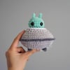 Free crochet pattern viewable at: https://www.sweetsofties.com/2025/08/pocket-alien-ufo.html