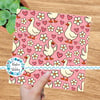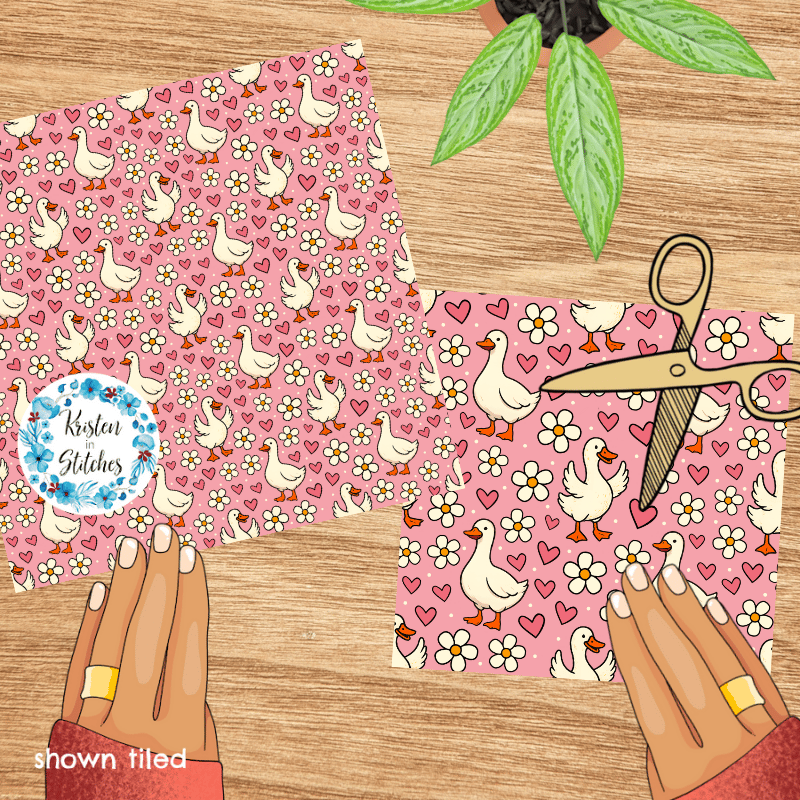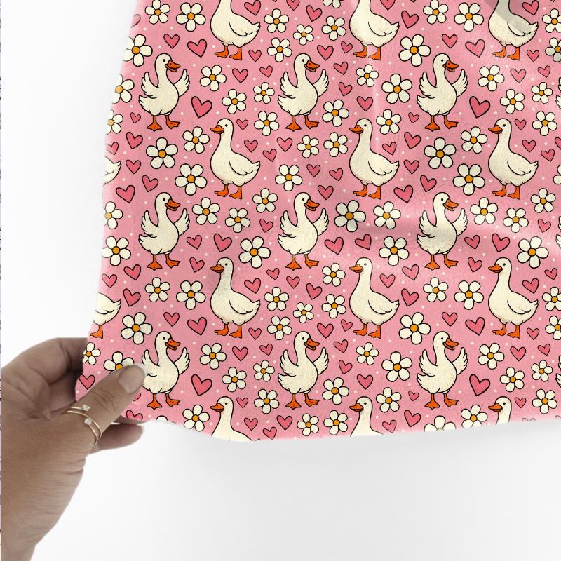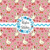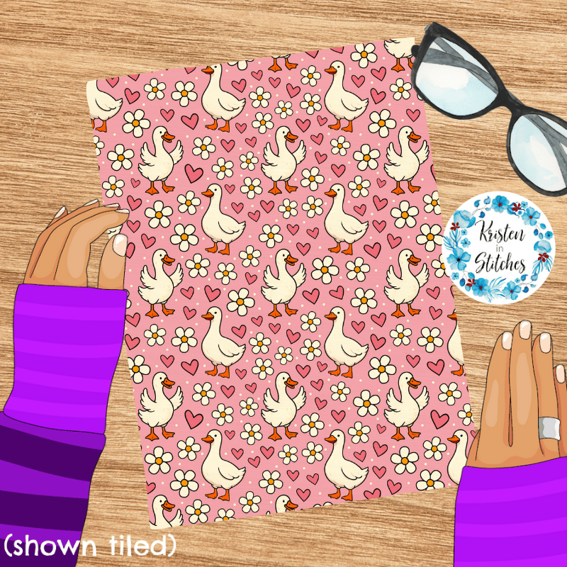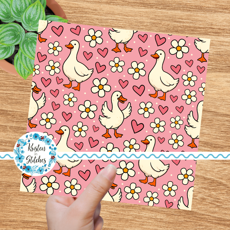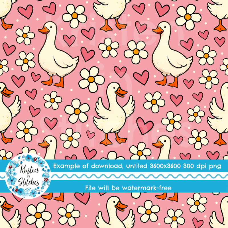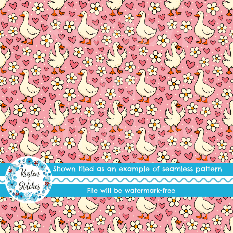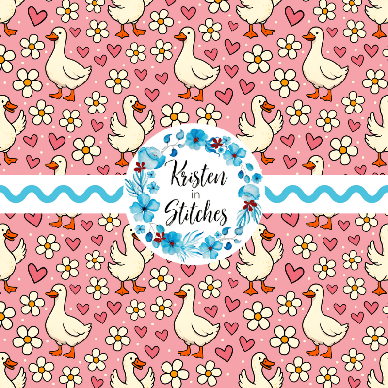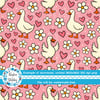 Spring Ducks Hearts and Daisy Flowers Seamless Pattern, Pink
