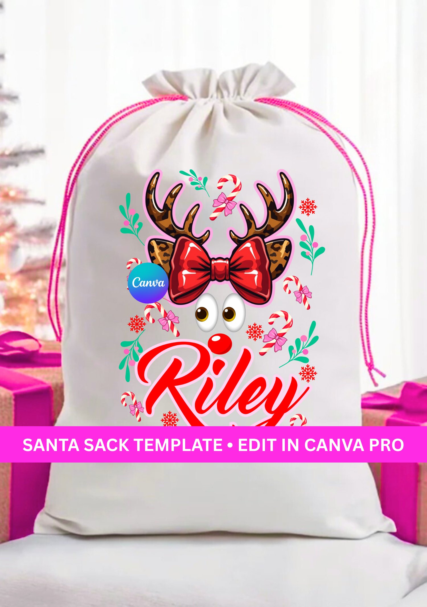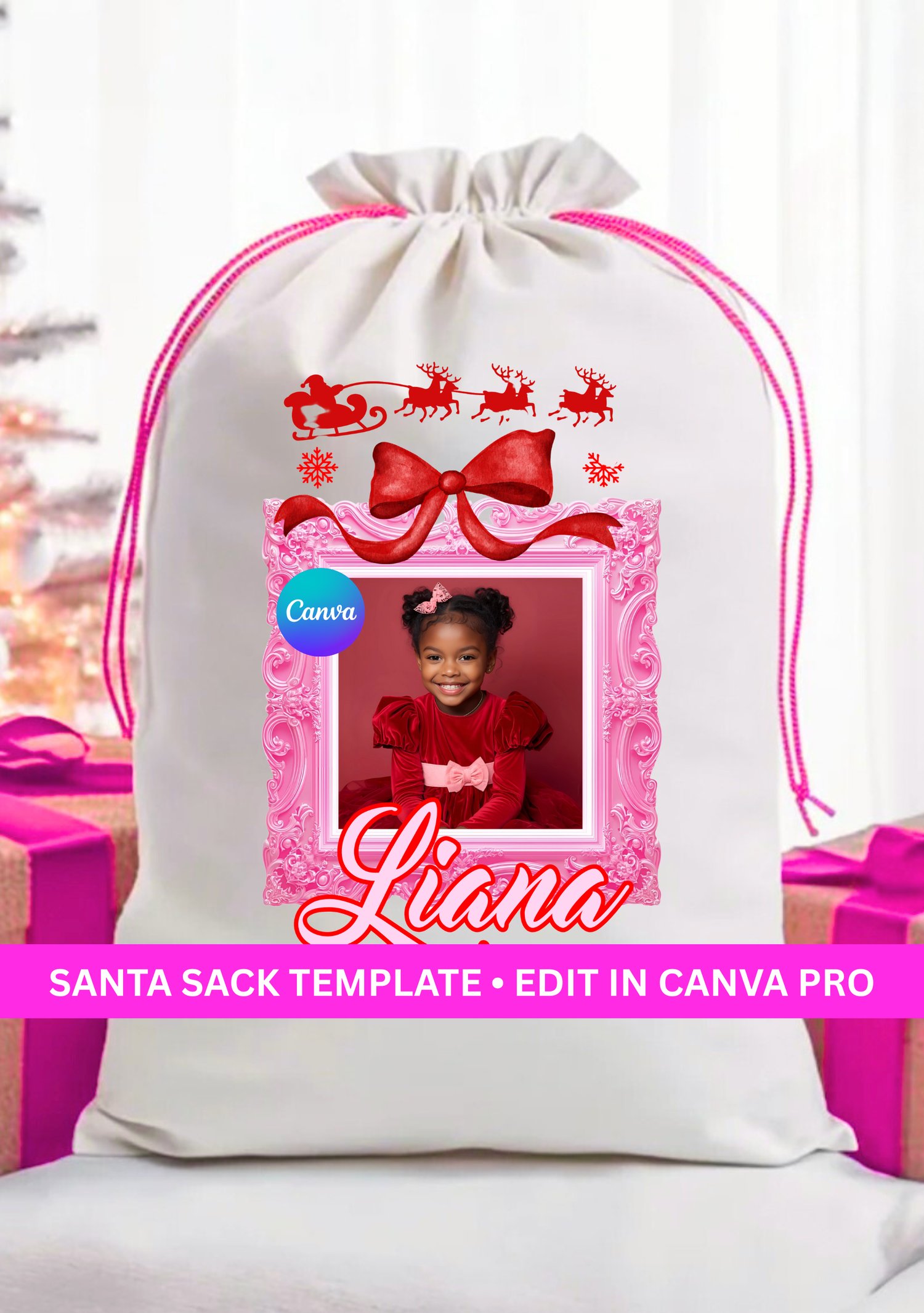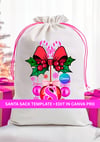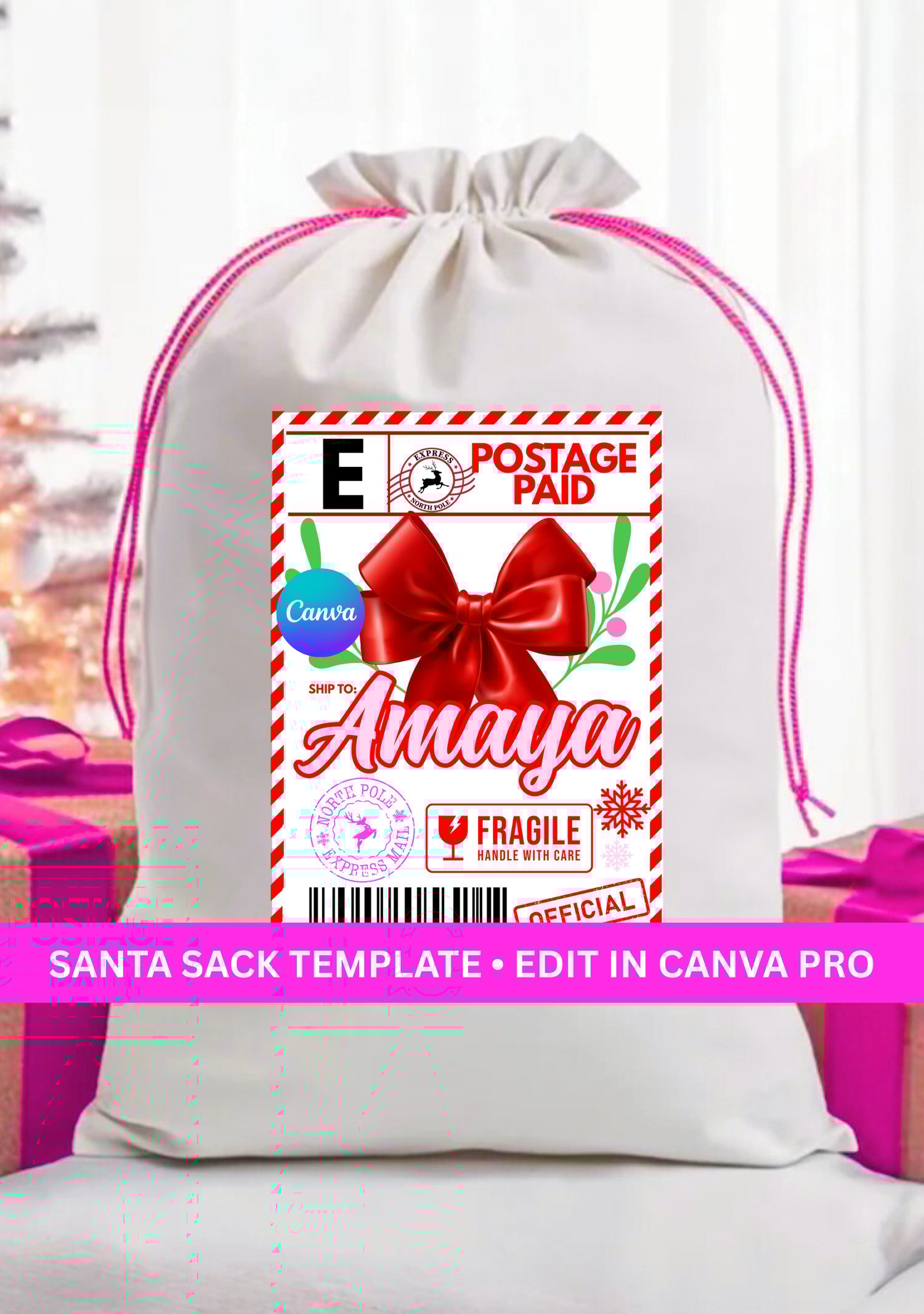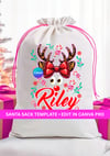 Customize the name, year, greetings, and colors using Canva Pro make each sack uniquely personal for children, family members, or holiday clients.