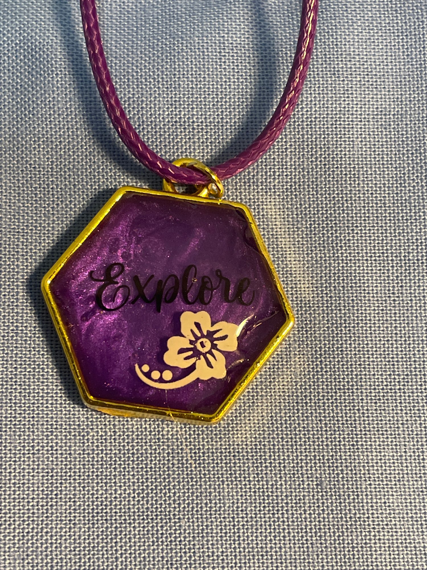 Word explore in a deep purple with a white flower