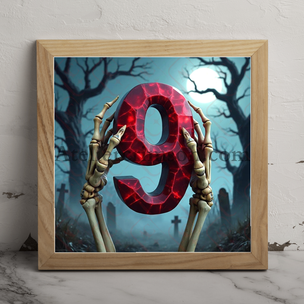 Number 9 ruby halloween skull Discover our eerie alphabet series featuring photorealistic ruby letters and numbers. Each character, crafted from deep red gemstone, floats mysteriously in a misty graveyard. Skeletal hands frame these gleaming symbols against a moonlit, Halloween-inspired backdrop. Perfect for gothic design projects or seasonal decor inspiration!