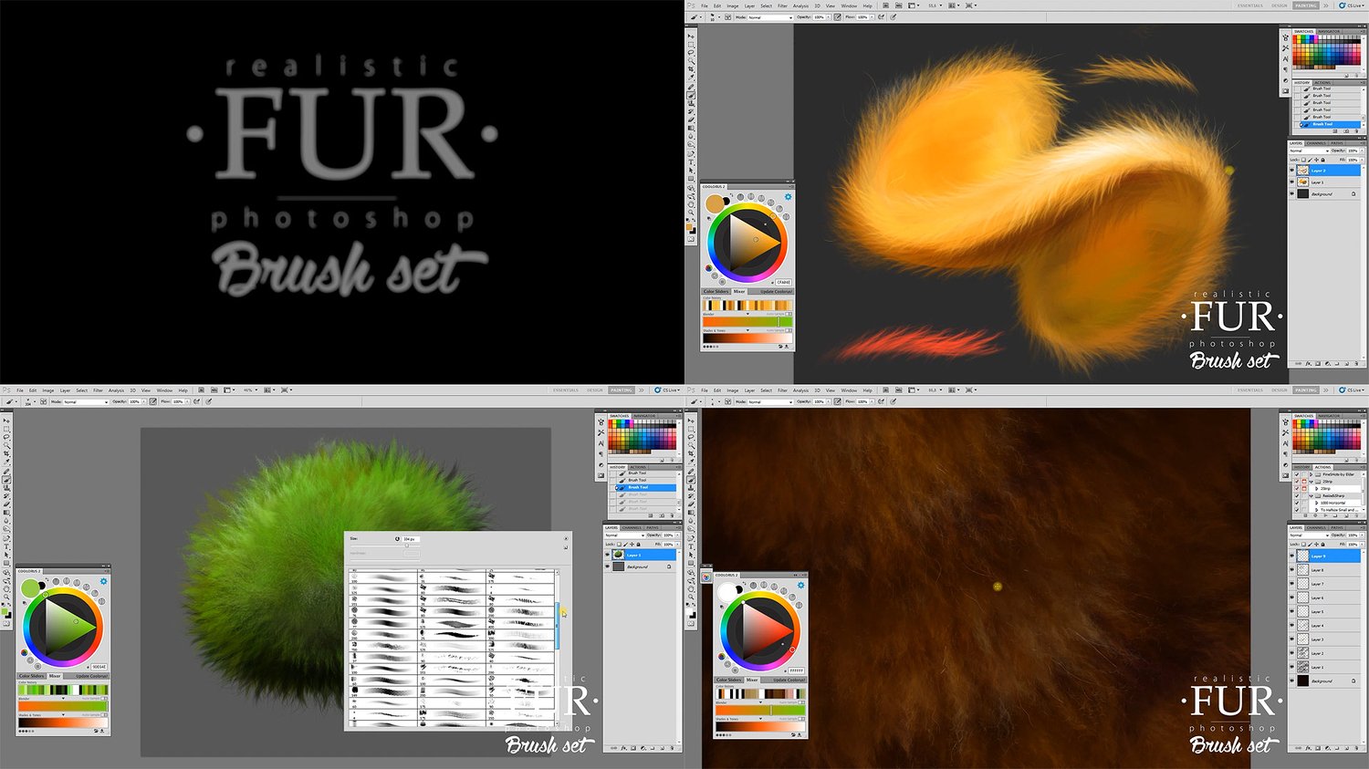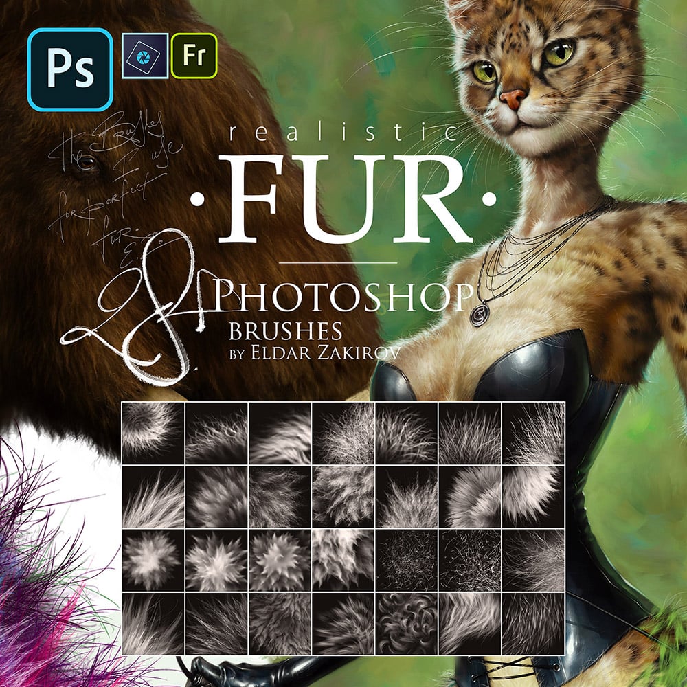 - 28+ FUR brushes saved in the "Realistic FUR 2015-2020 Brush Set by Eldar Zakirov. Rel.3.0.abr" file;