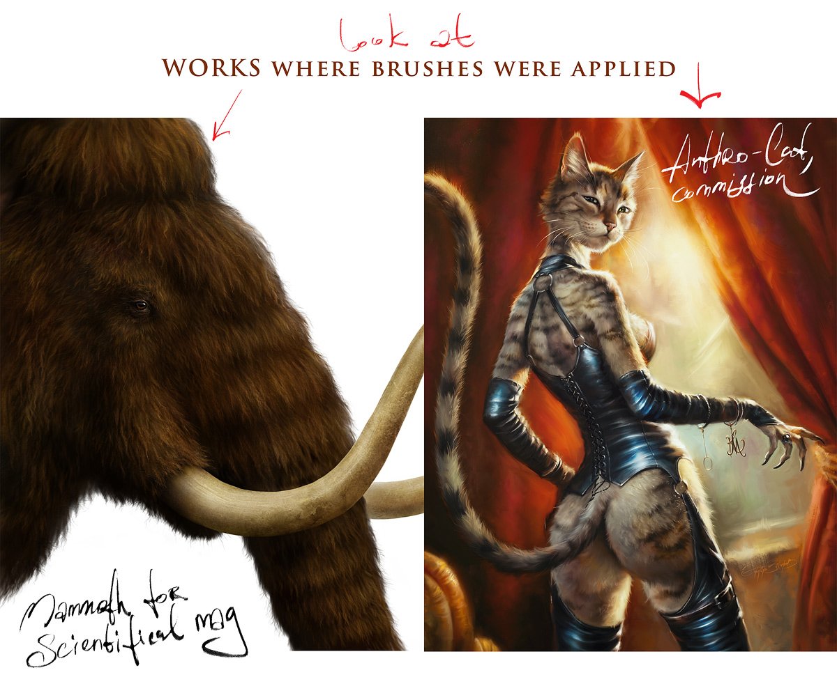 I've worked to learn how to draw realistic fur for some years, and I can be proud that I've reached this goal (and keep moving on). To simplify the work process, I created a series of brushes for myself, and I'd like to share them with you, friends. My brushes allow you to create high-quality, realistic fur styles and countless combinations. So I'm sure you'll appreciate the assistance that they will give you during your work!