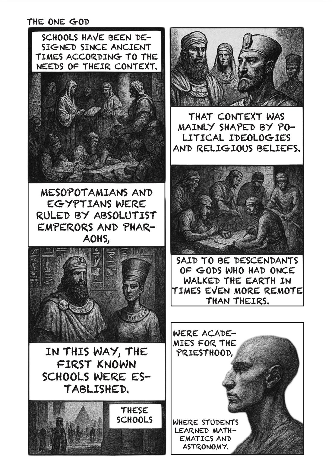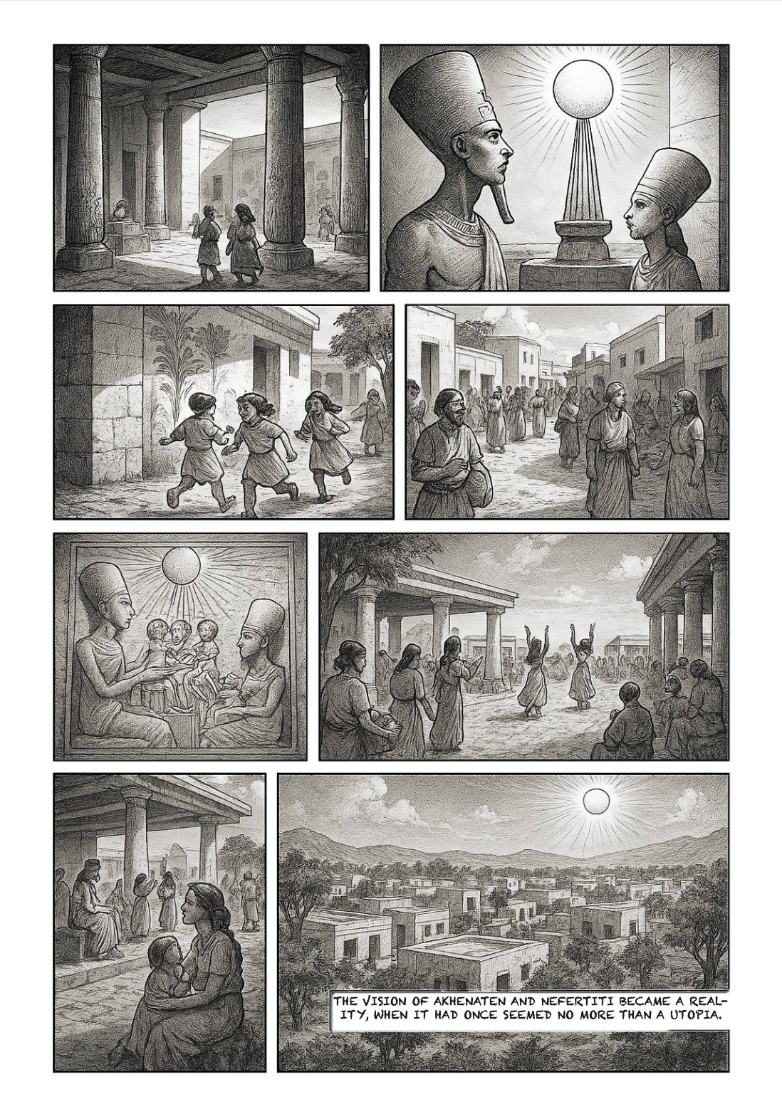 The One God is an illustrated comic that tells the extraordinary story of Pharaoh Akhenaten — the heretic king who defied tradition, rejected the old pantheon, and established the first known form of monotheism, devoted to Aten, the solar disc.