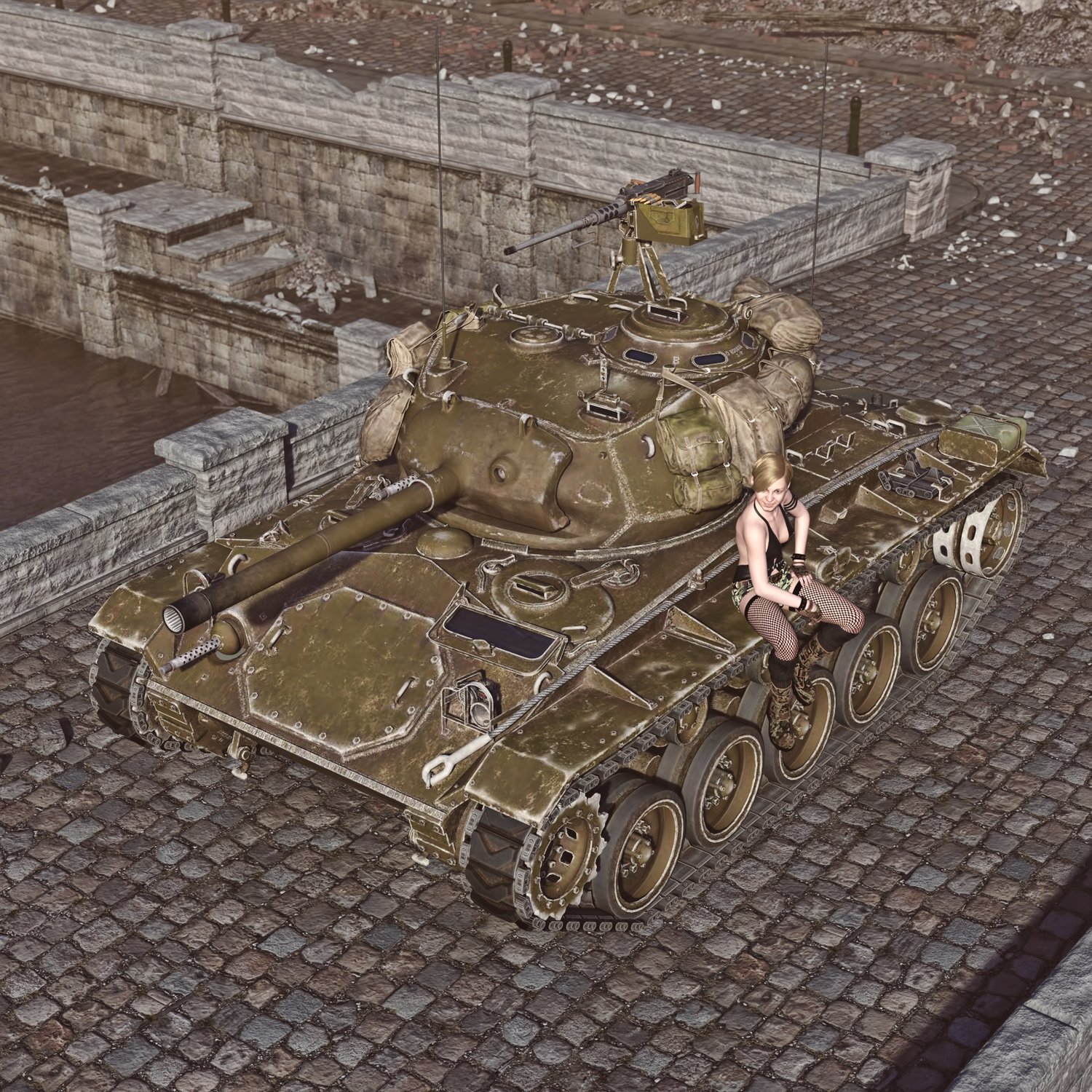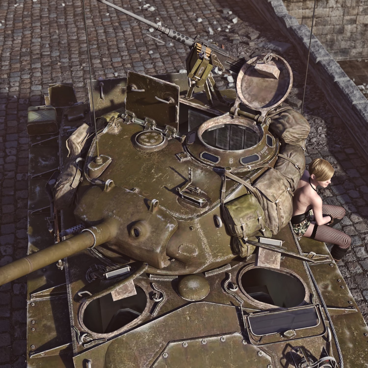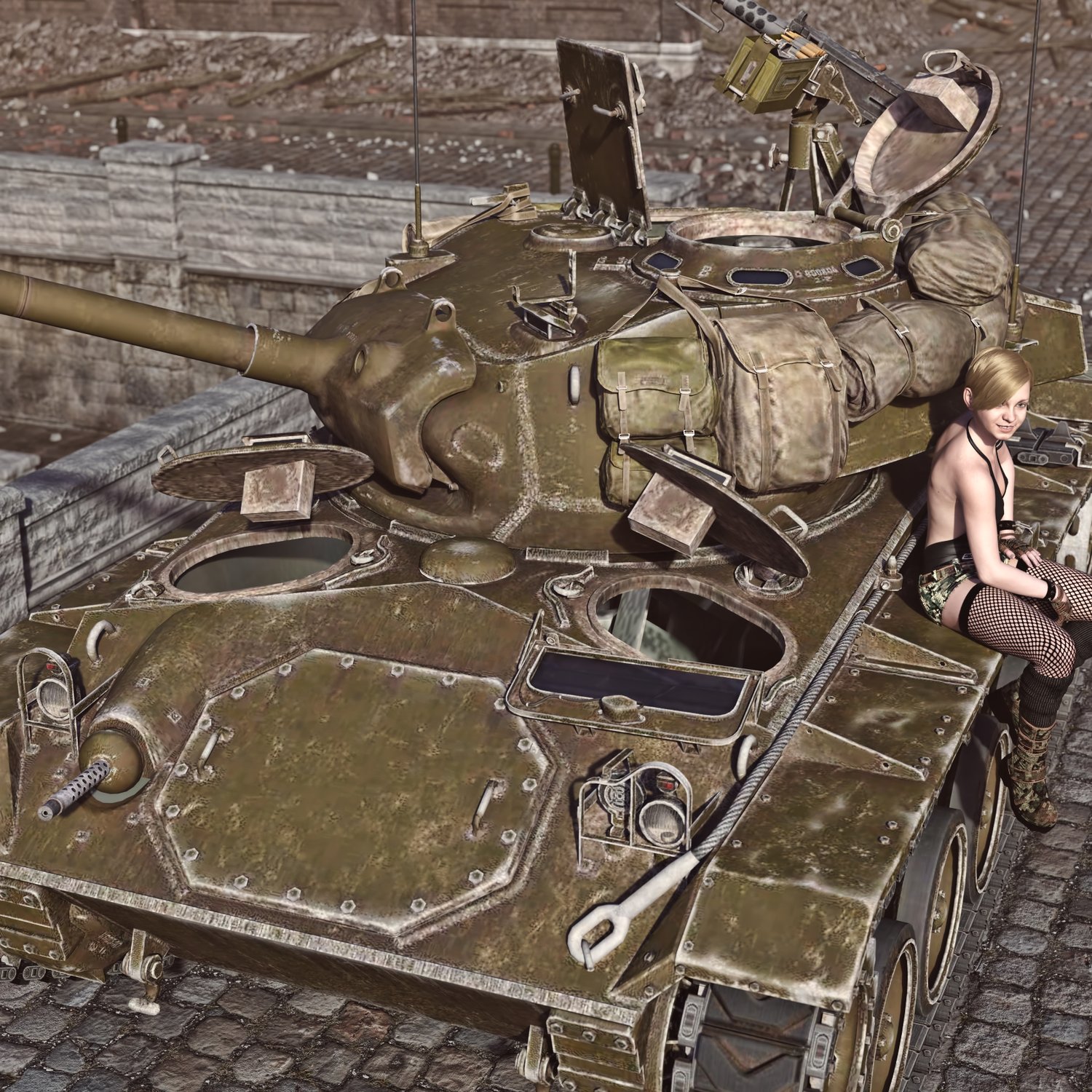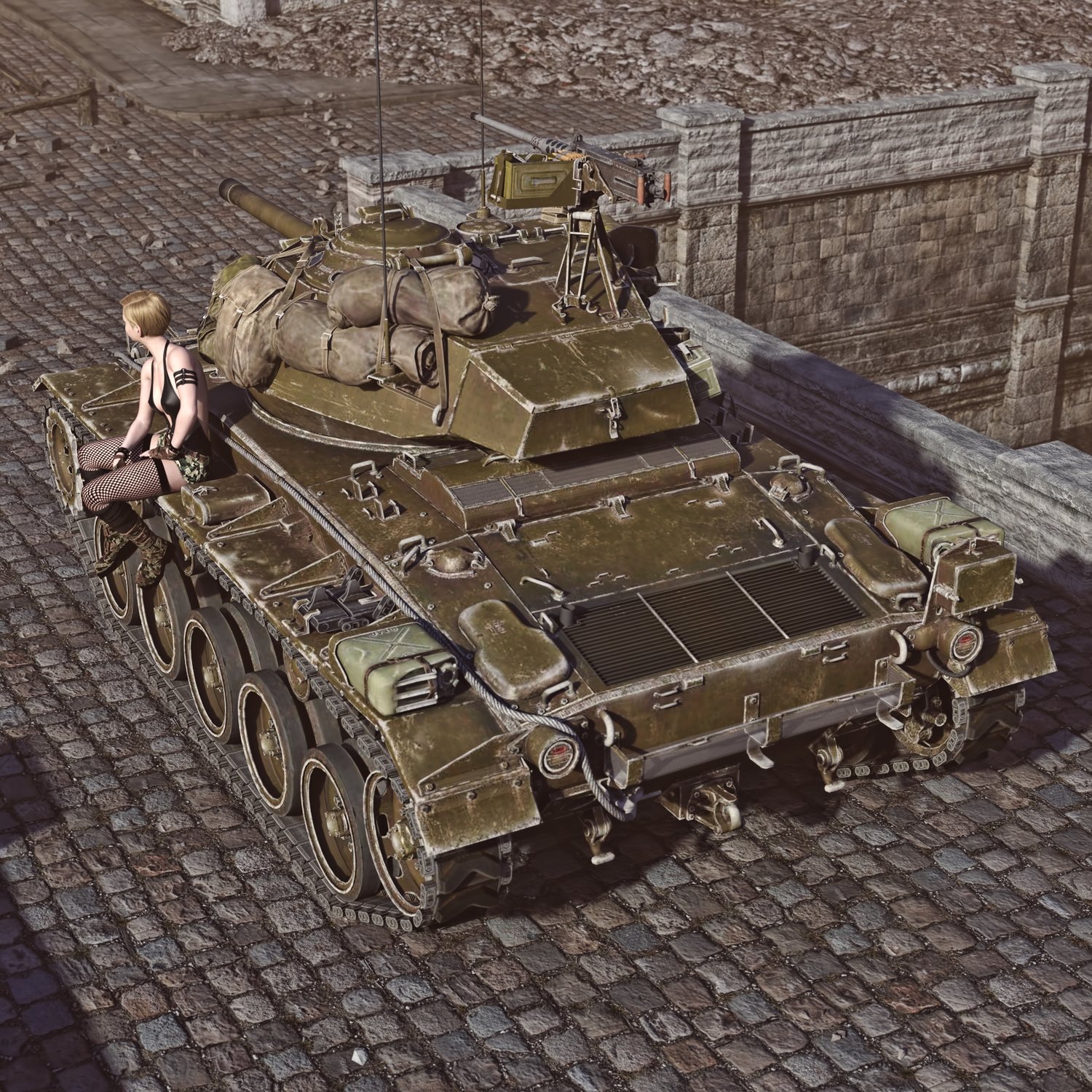 An American light tank used in the later parts of WW2 and even some time after that. Cool looking piece of armored vehicle, with nice main gun and M2 heavy machine gun as a support gun on the turret, for manual use. Turret and gun rotate and pivot. Machine gun in the front is also movable. M2 gun is also partially rigged, so it can rotate and pivot, for more realistic pictures. Drivers' hatch is rigged. Turret hatches rigged. Front hatch is also rigged. Good as a main tank or as a fire support for infantry. The prop is converted and rigged for DAZ.