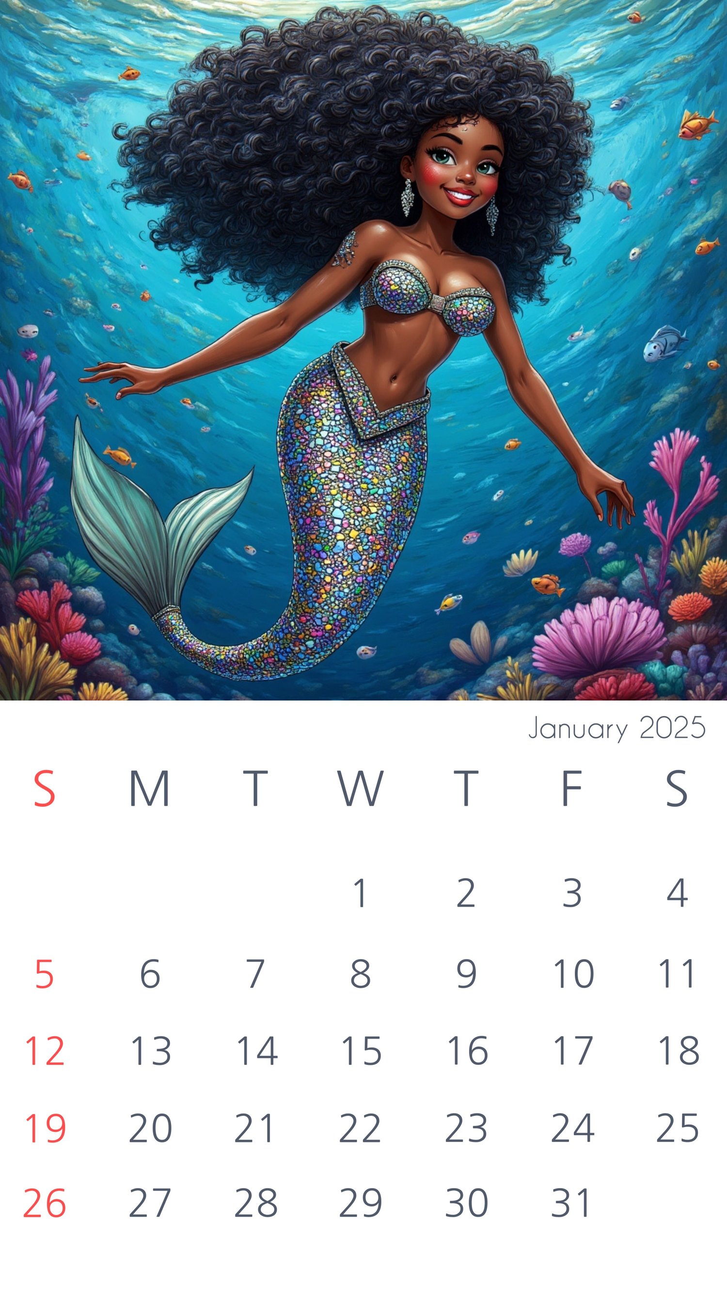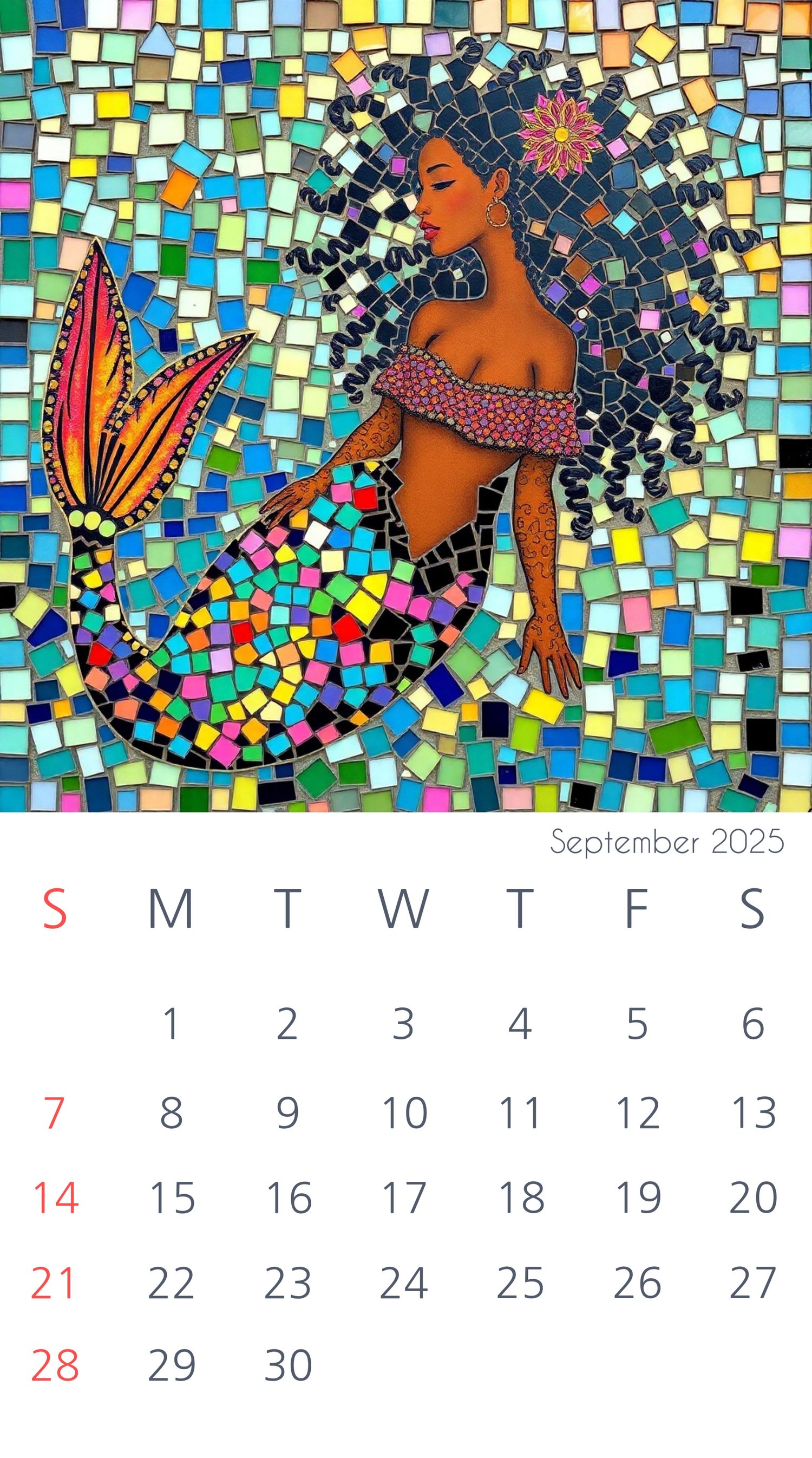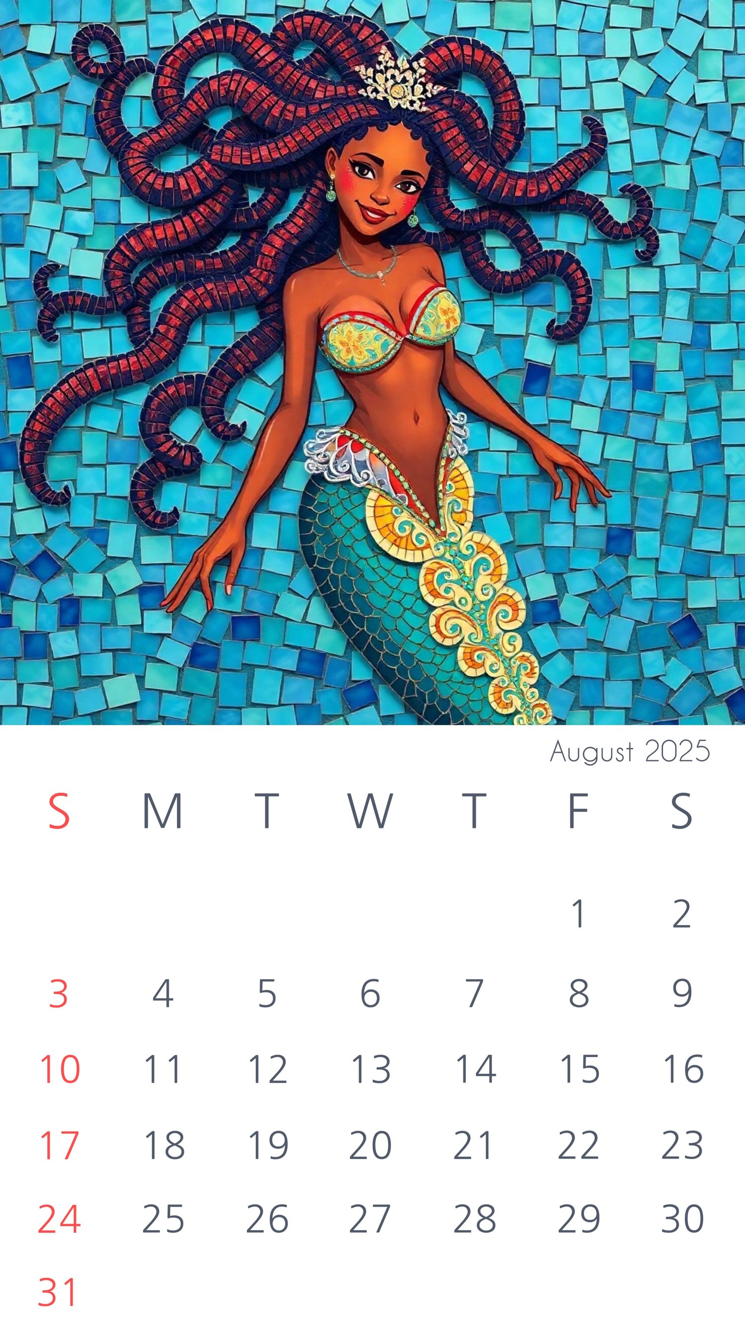 Dive into a mesmerizing world of artistry and representation with this 17-month Black Mermaid Calendar for 2025/2026. Each month unveils a stunning, AI-generated masterpiece, blending the flowing elegance of watercolor with the intricate detail of mosaic artistry. Featuring gorgeous Black mermaids, this collection celebrates beauty, diversity, and imagination like never before.