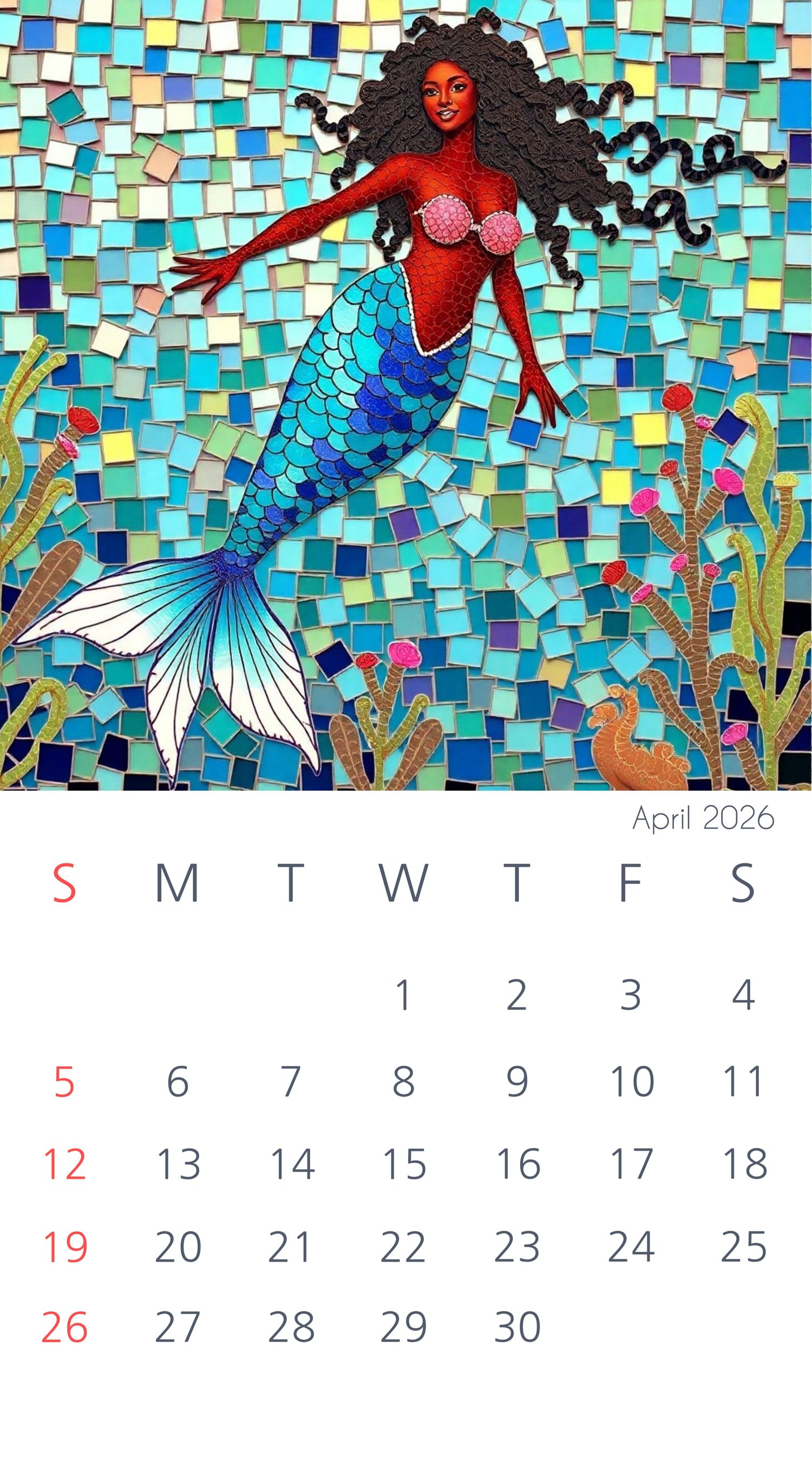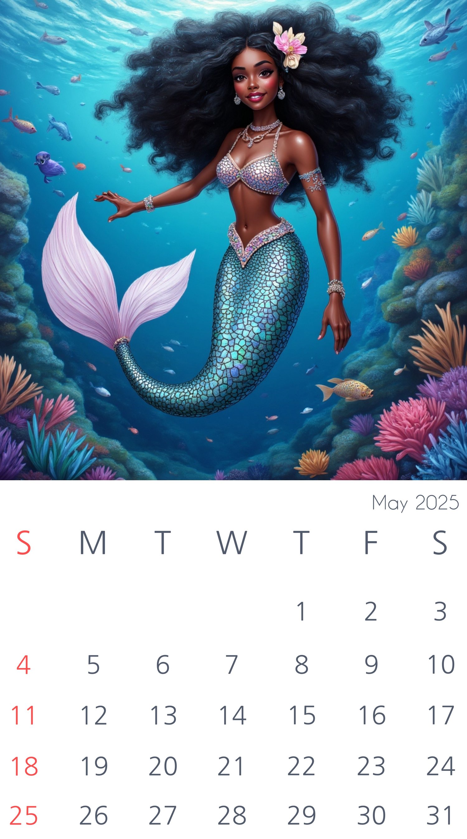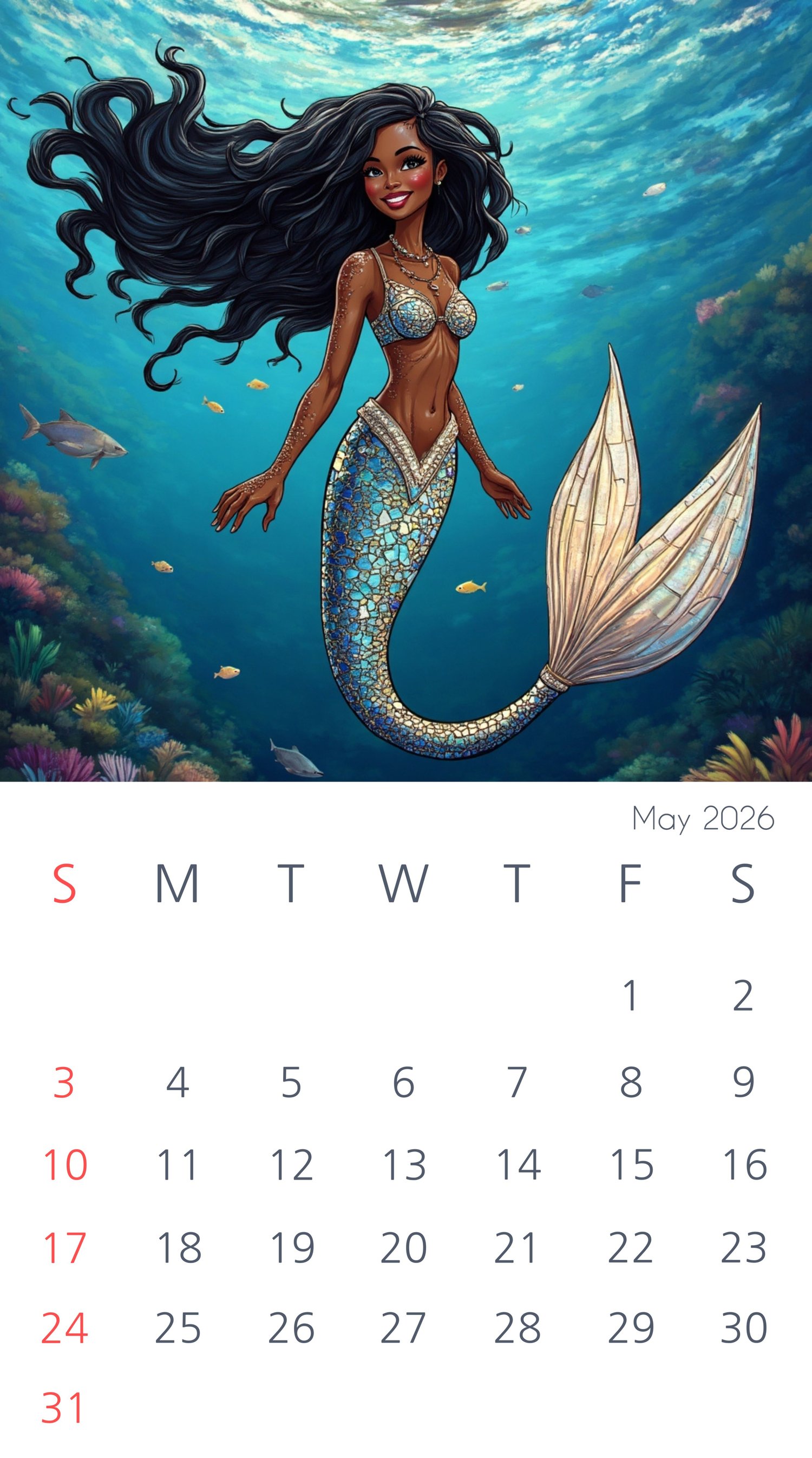Dive into a mesmerizing world of artistry and representation with this 17-month Black Mermaid Calendar for 2025/2026. Each month unveils a stunning, AI-generated masterpiece, blending the flowing elegance of watercolor with the intricate detail of mosaic artistry. Featuring gorgeous Black mermaids, this collection celebrates beauty, diversity, and imagination like never before.