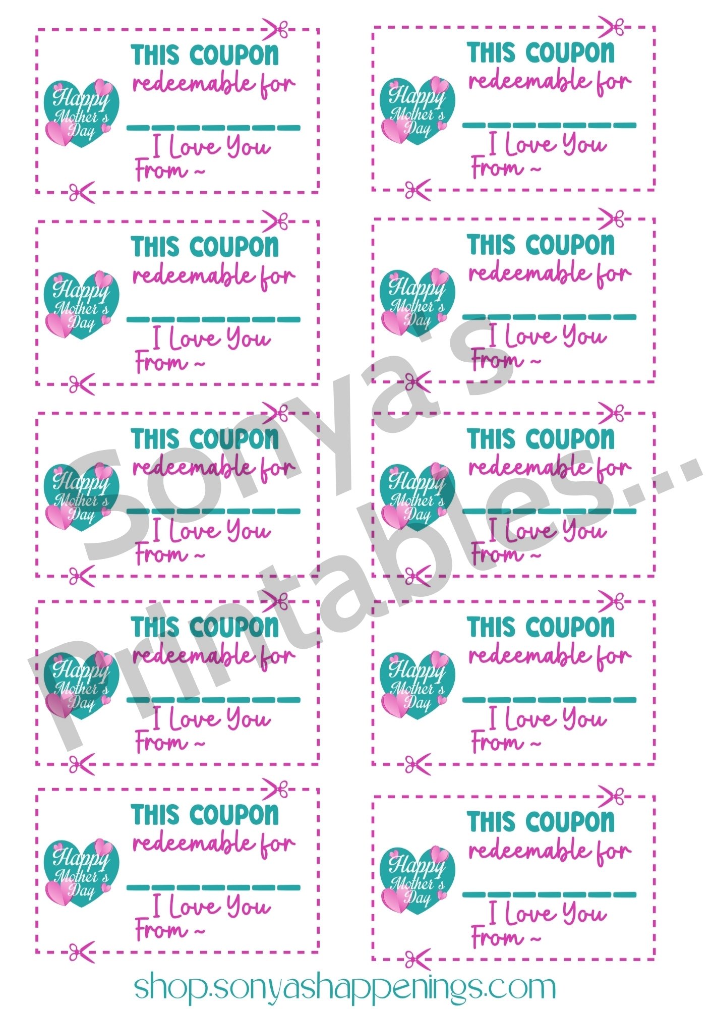 These "Mother's Day Coupons" are great for anyone to give their Mother (no matter their age). "Mother's Day Coupons" are colorful and CUTE! There are 10 gift tags per page and you'll receive 3 PDF pages. You'll be able to print and reprint as many times as you like as long as you save your file after you download it.