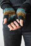 Classic Shetland Fingerless Mitts featuring the all-over motif from the Radiant Star Cowl (found in the Shetland Wool Week Annual 2020) and a seeding pattern on the palm. Inspired by all-over jumpers of the 70s and 80s with a bright retro colour palette.