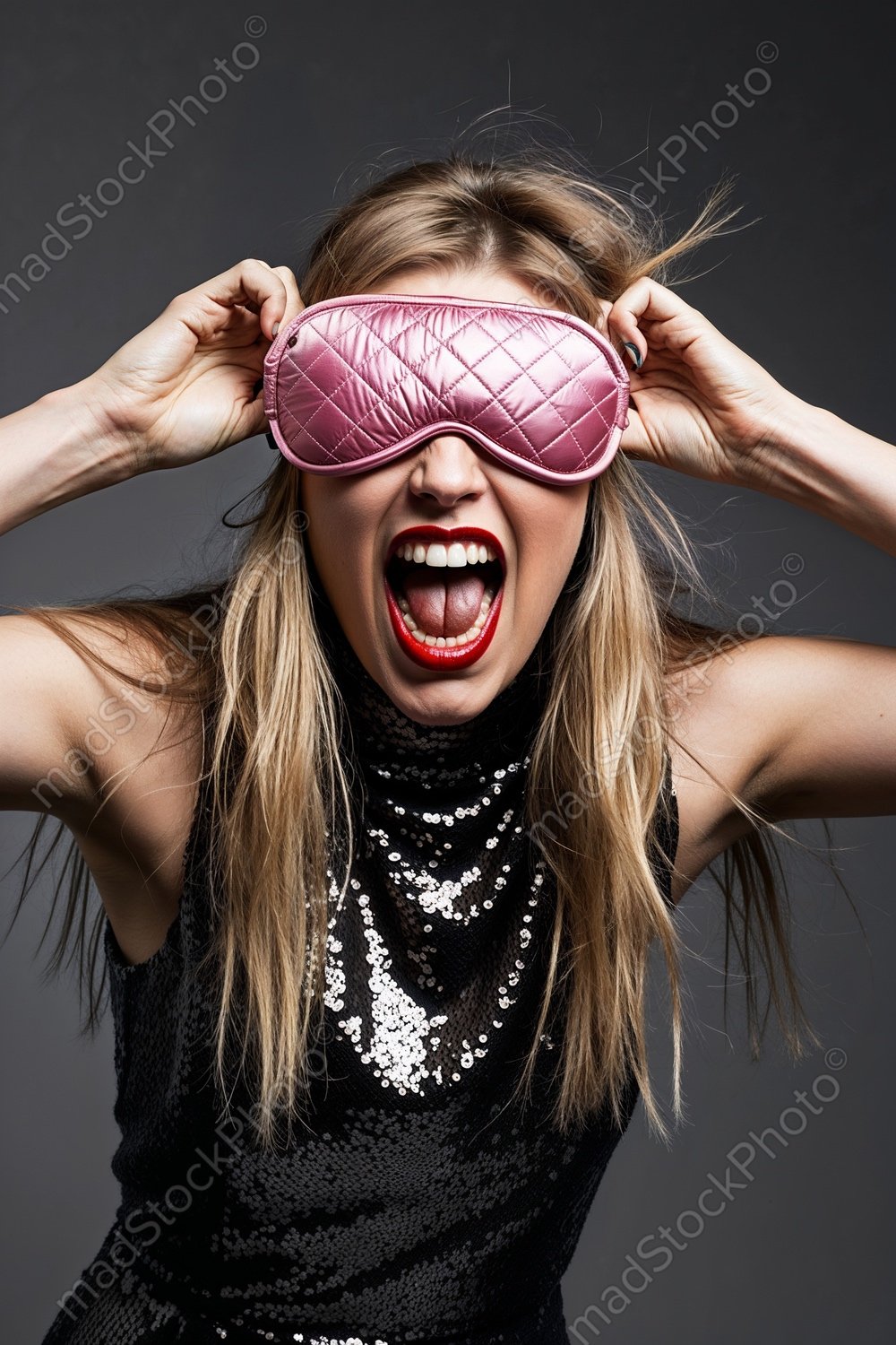 party, woman, pink sleep mask, sparkling dress, shouting, bold expression, red lipstick, vibrant energy, blonde hair, playful pose, fun, confident, glamour, sequin outfit, nightlife, energetic, modern fashion, stylish, outgoing, cheerful, dynamic pose, bold makeup, festive vibes, carefree, laughter, night out, urban style, bold attitude, happy expression, fun-loving, glamorous, fashionable, expressive, party vibes, carefree energy, strong personality, beauty portrait, shiny dress, playful energy, radiant, joyful, trendy, bold fashion, party fun, exciting vibes