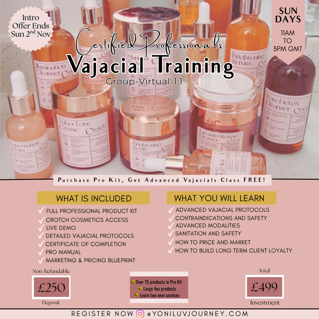 You will attend a one day training with YoniLuv Academy in London, UK. The training will cover Advanced Vajacial protocols including detoxing, hydrating, exfoliating and brightening whilst learning two new modalities to deliver results from the first treatment.