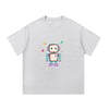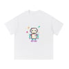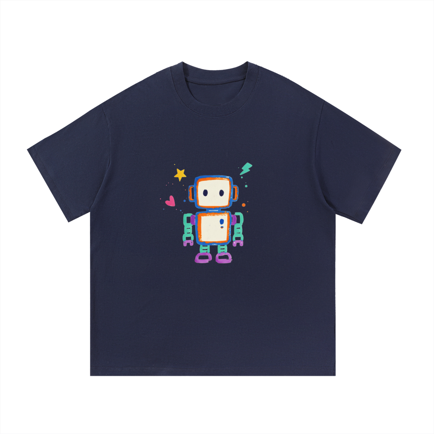 A charming, stylized illustration of a simple, square-headed robot. The artwork has a playful, hand-drawn, chalk-like texture and features a bright, contrasting color palette of orange, blue, teal, and magenta. Small, colorful elements like a yellow star, a pink heart, and a teal lightning bolt are scattered around the main figure, giving the piece an energetic, joyful, and slightly retro feel, reminiscent of children's doodles or 8-bit graphics.