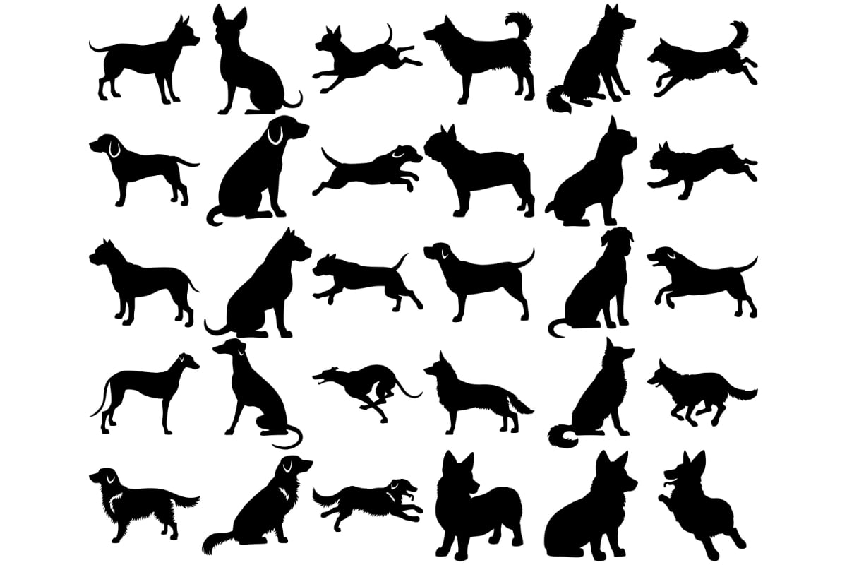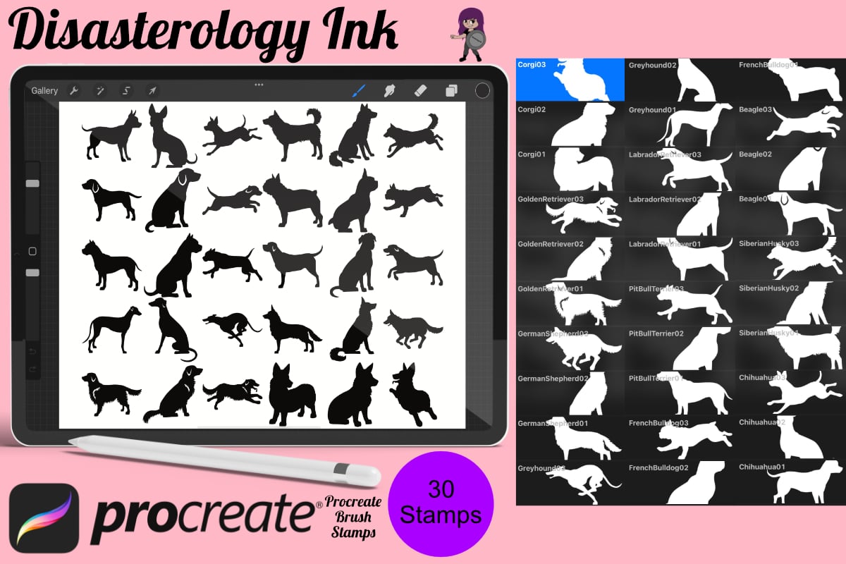 Dog Silhouette Procreate Brush Stamp, 30 stamps, 3 of each breed, 10 breeds of dog.