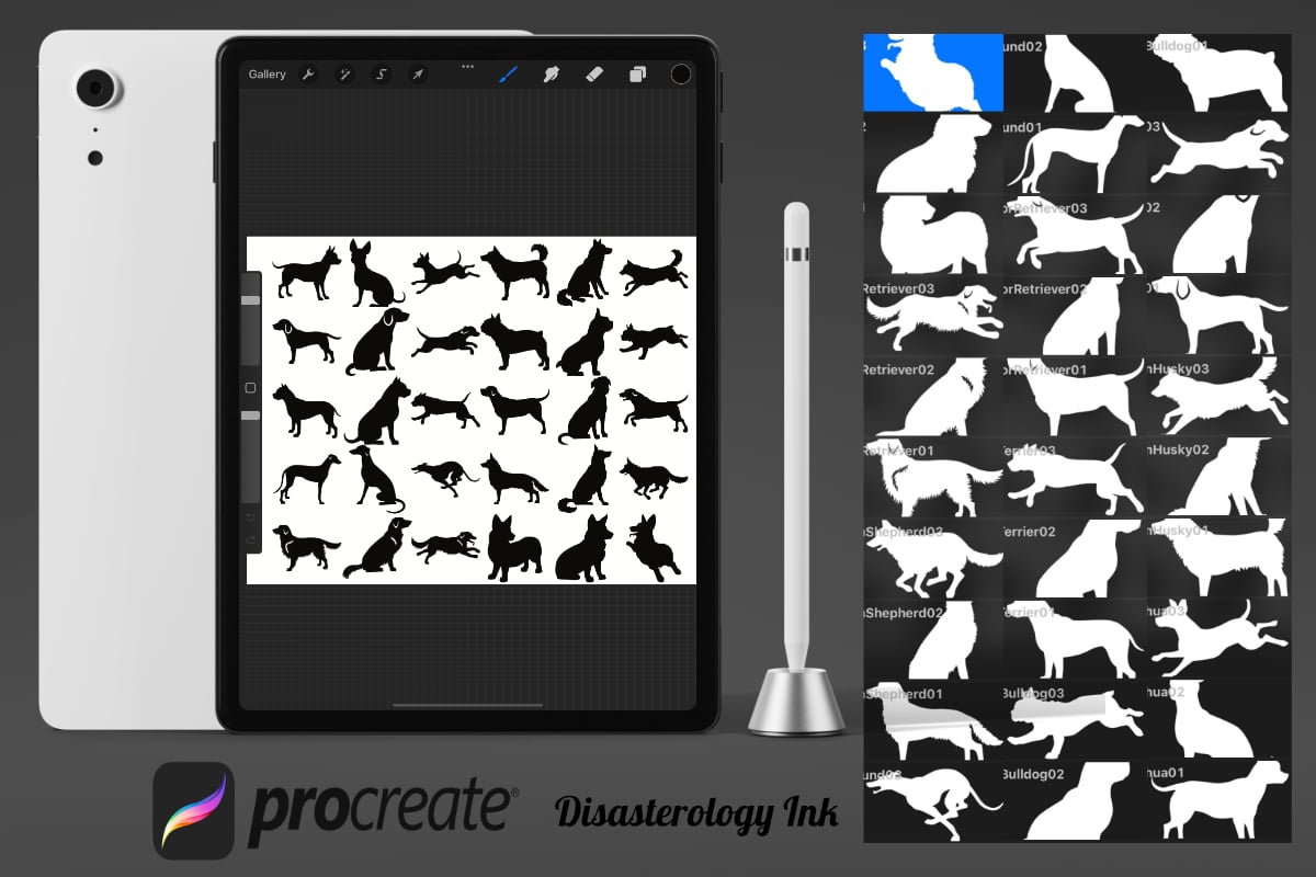 Pack of dog silhouette Procreate Stamp Brushes! These dog stamps are perfect for making illustration projects or any procreate purpose. You can use these in any colour or opacity and they can be resized to best fit your art. You need Procreate 5.0.8 or 5X, an iPad, and an Apple Pencil. Also, these stamp brushes are not pressure sensitive and can be used with third party stylus, Apple Pencil or even your finger. You can change the colour, size and opacity of these stamps.