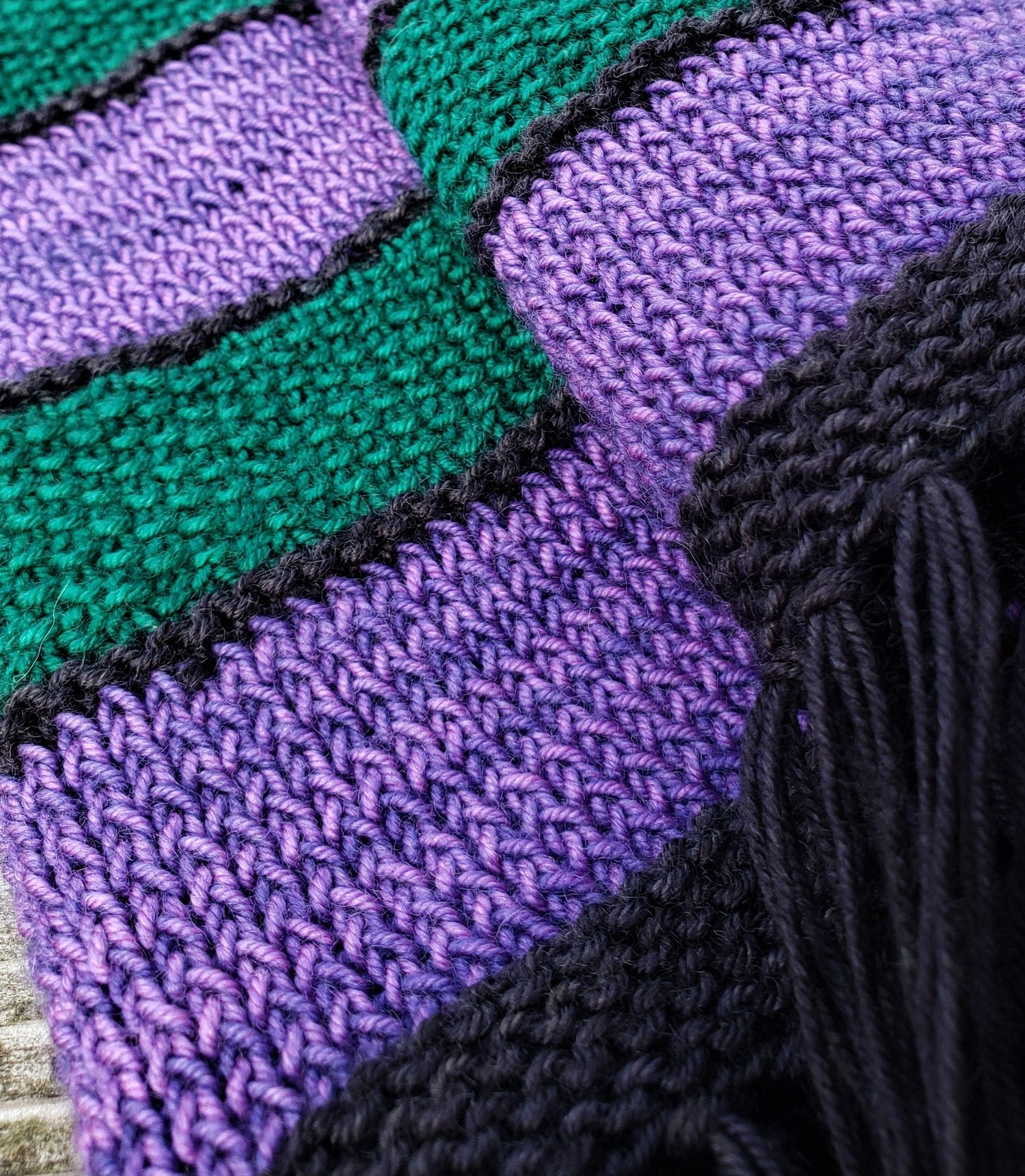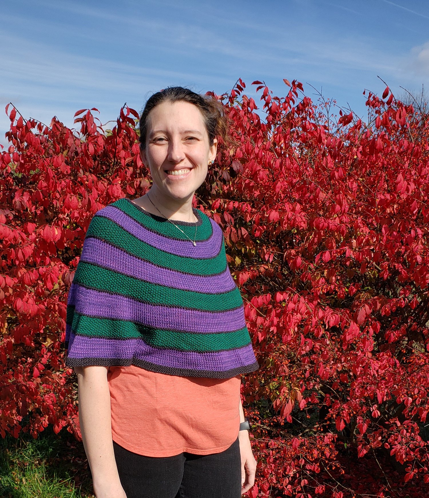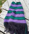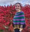 A lovely little capelet, knit in fingering weight yarn for when you need just a bit of warmth. Stripes and textures to keep the knitting interesting, and finished with whimsical fringe!