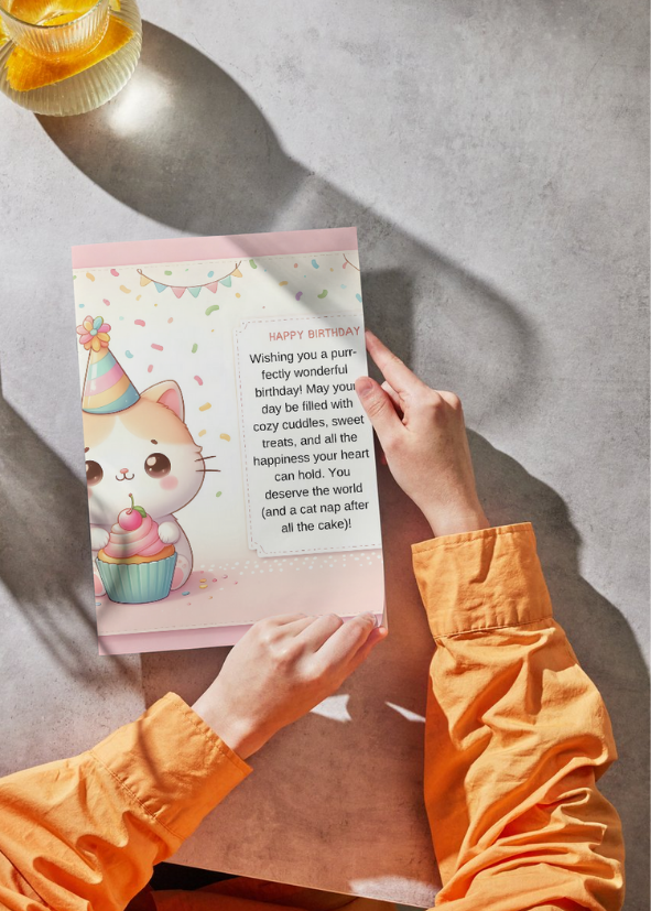 * One High-Quality Happy Birthday Card Design: As shown, complete with the irresistible fluffy cat artwork and the pre-written birthday message inside.