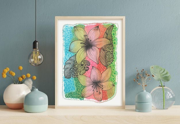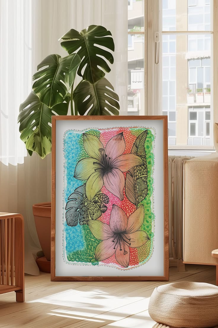 Elevate your space with this vibrant, hand-drawn tropical floral art print. Featuring a stunning blend of watercolor gradients and intricate Zentangle ink details, this piece captures the elegance of Lilies and Monstera leaves in a unique, bohemian style.