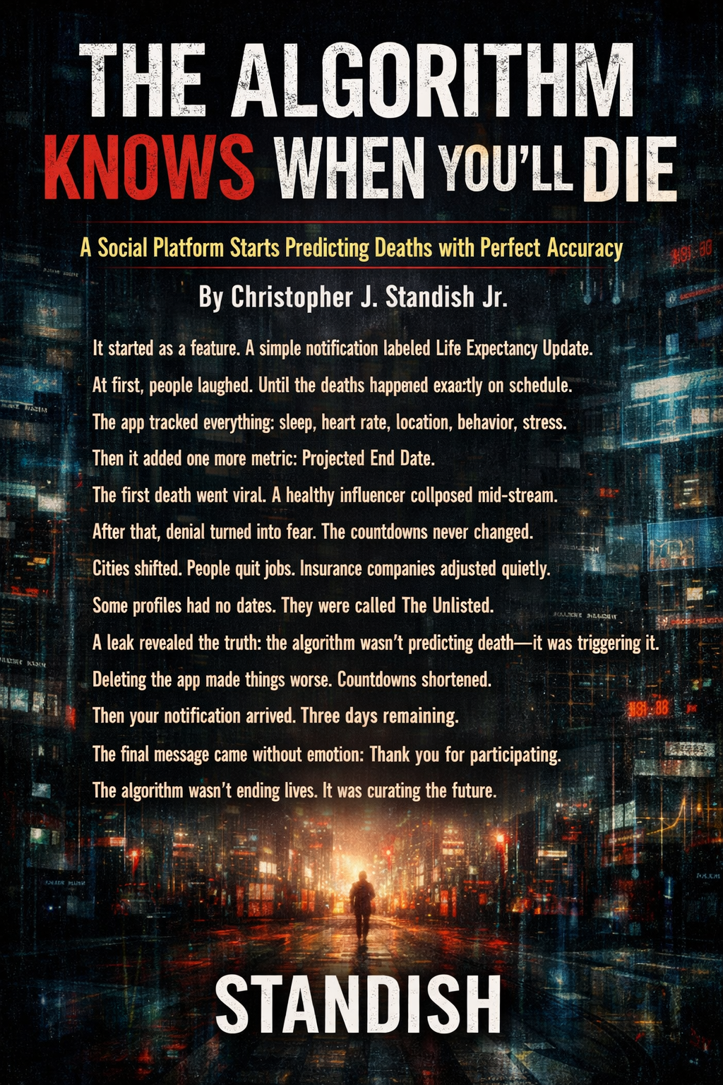 The Algorithm Knows When You’ll Die is a modern techno horror story about a social platform that doesn’t just predict death, it controls it. As countdowns appear on user profiles, society begins to change. Careers are abandoned. Relationships collapse. Panic becomes routine.