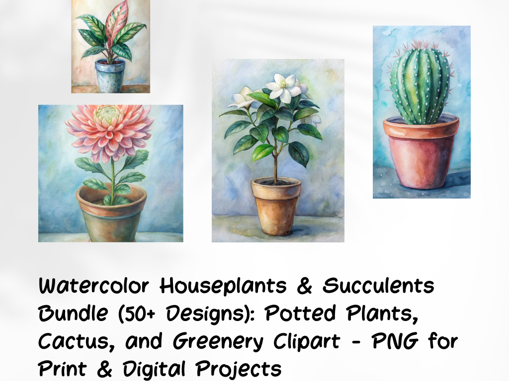 Watercolor Houseplants & Succulents Bundle (50+ Designs): Potted Plants, Cactus, and Greenery Clipart - PNG for Print & Digital Projects