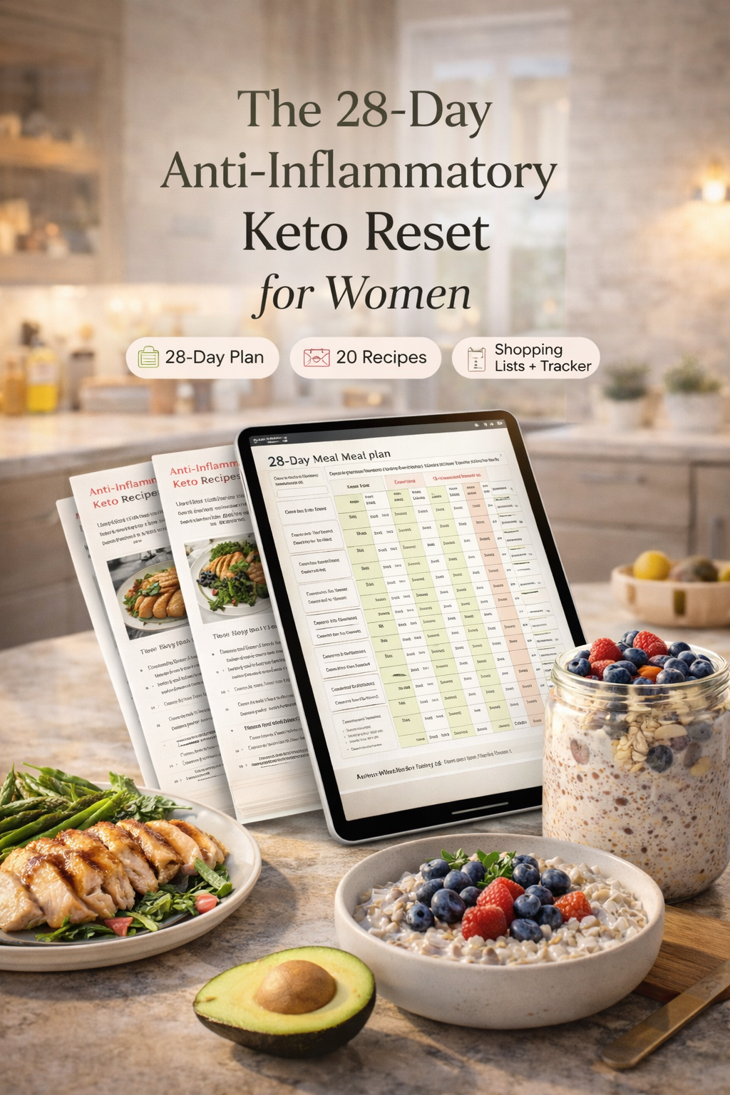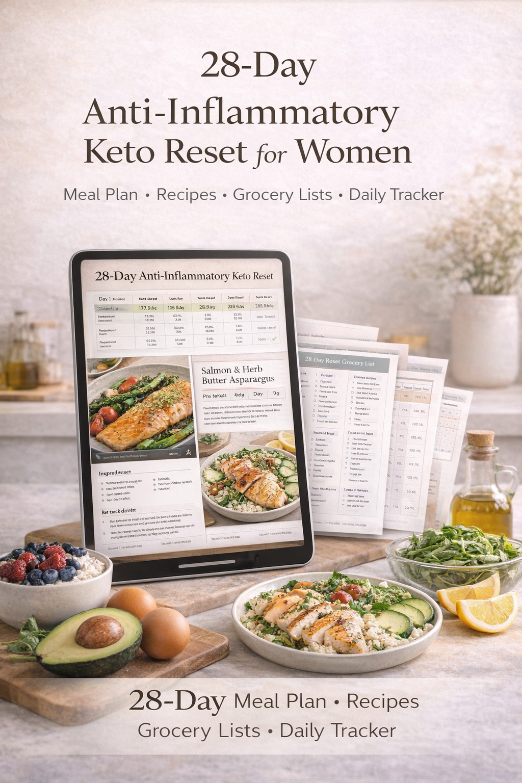 The 28-Day Anti-Inflammatory Keto Reset for Women is a beautifully organized digital guide created for women who want a more structured approach to low-carb eating — without overwhelm, random meal ideas, or complicated wellness rules.