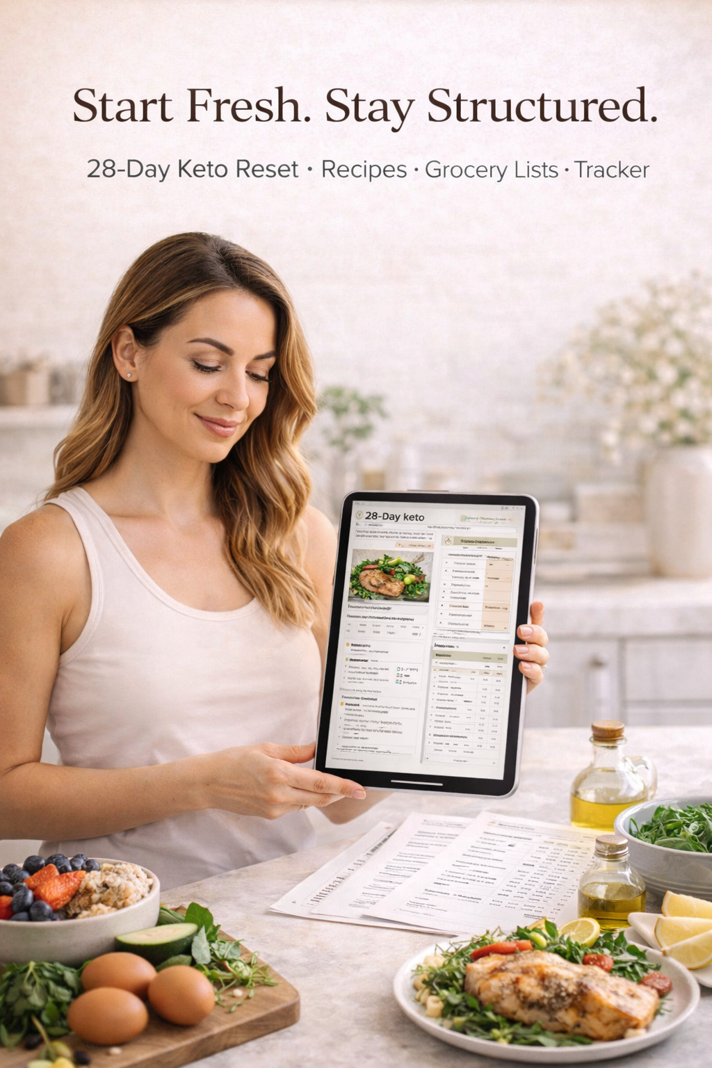 Instead of leaving you with scattered keto advice, this guide gives you a practical 28-day reset system built around meal structure, nourishing recipes, shopping support, and daily tracking.