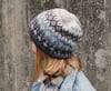The accessory is written in sizes 1 (2, 3, 4, 5) (6, 7, 8, 9) to fit all ages. Roughly speaking, the sizes have been graded to fit actual head circumferences of 16 (17, 18, 19, 20) (21, 22, 23, 24)” / 40 (42.5, 45, 47.5, 50) (52.5, 55, 57.5, 60) cm but the sizes are flexible; choose a size with more negative ease for a tighter fit or choose a size with less negative ease at the headband (and even positive ease at the colourwork) for a more slouched fit.