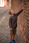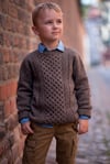 The pullover is worked from top to bottom and begins at back neck. The sweater is worked in St st with front cable panel consisting of two Honeycomb patterns. All front increases, both raglan and neck, are charted for each size. The sleeves are worked in the round in St st and finished with 1x1 Rib. Finally, two cabled elbow patches are knit, and once blocked, they are seamed to the sleeves.