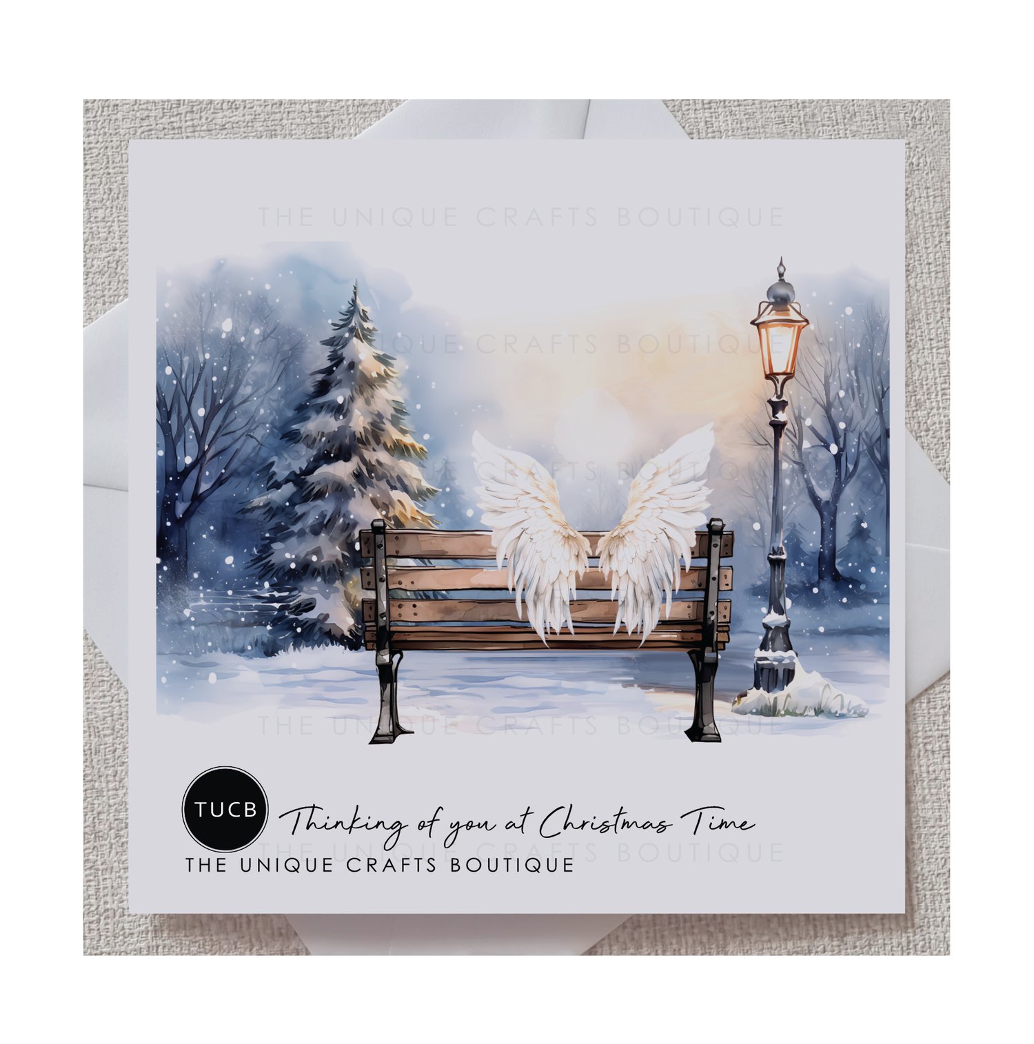 Printed with a beautiful snowy Winter woodland scene. Sitting on a bench beside the lamp post is the impression of a lost loved one with a set of Angel wings. The greeting 'Thinking of you at Christmas time' is displayed below.