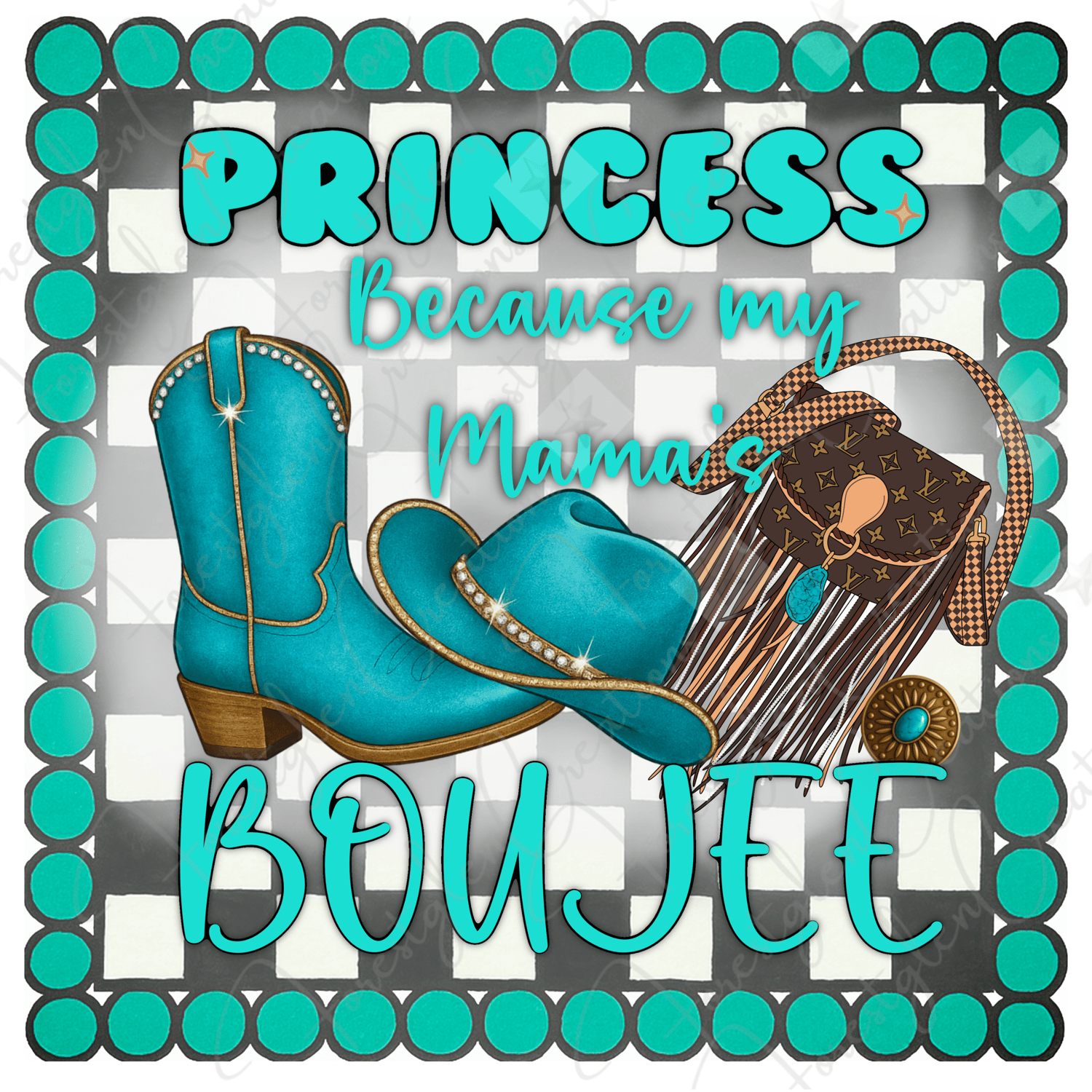 Bring a little sparkle to your western vibes with this "Princess Because My Mama’s Boujee" digital design! Featuring turquoise cowgirl boots, a pearl-trimmed hat, a luxury-inspired fringe bag, and a bold checkerboard frame, this design is perfect for shirts, tumblers, tote bags, and more.