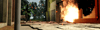 - Burned-out vehicle scene with active flames/embers for high-tension set dressing