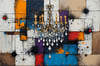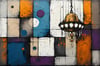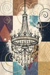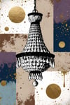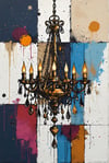 A bold geometric pop-graffiti artwork featuring a large central chandelier outlined in expressive black strokes. The design blends abstract expressionism, pop art, and urban graffiti street art, with vibrant color blocking, textured details, and gold accents. Perfect for scrapbooking, canvas prints, posters, or statement wall art, and so much more.