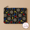 This hand-drawn dartboard seamless pattern features bold red, blue, and yellow darts layered over dark striped background panels for a clean, modern sports-inspired look.
