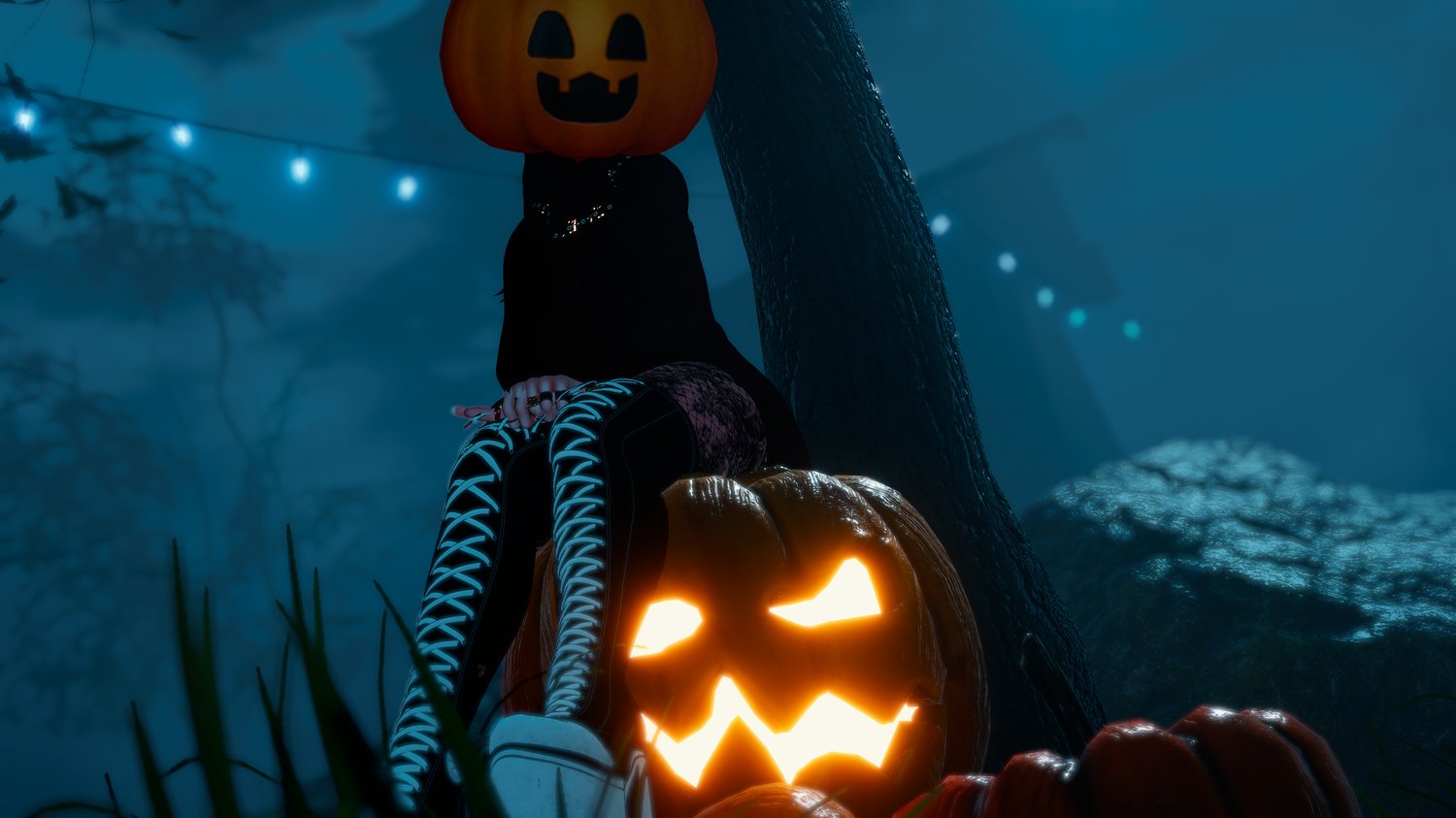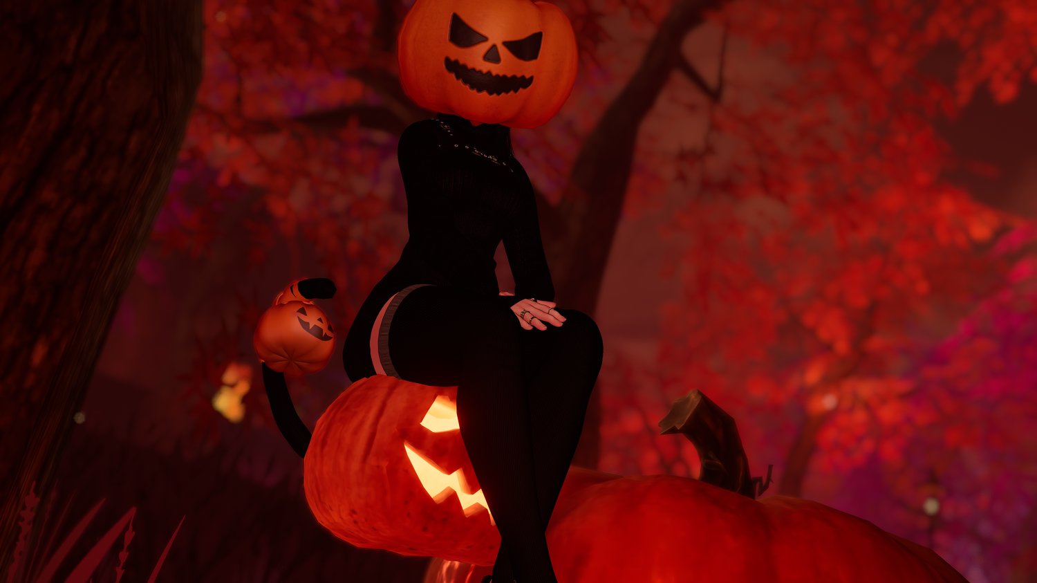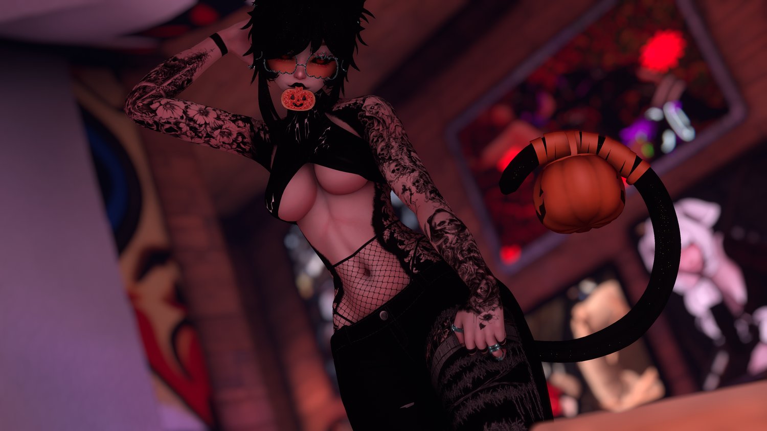 Head (Personal Sculpt by Bugsy), Body (sculpted by me), Pumpkin Head, Fishnets, Mr.Chibbins, Glasses, Pumpkin Head Bobber, Tail, Donut, Sweater, Head Particles, Thigh Highs, Lip Texture, Converse Heels, Slayer Dress, Converses, Hair 1, Shorts, Horns, Half Top, Pasties, Hair 2, Rings, Tattoos, Ears, Hair 3, Hair 4, Thong, Cropped Shirt, Jeans,