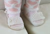 These 3ply garter stitch baby sandals have a buttoned ankle strap, and buttoned foot strap knitted sideways. This style of sandal is also available in 4ply and 8ply.