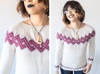 This yoke pullover is worked bottom-up, in the rnd. There is some short row shaping worked at the end around the back of the neck for a better fit around the shoulders. For best fit, select the pattern measurements that 2 - 4 in./5 cm - 10 cm more than your actual size. See the image for the sizing.