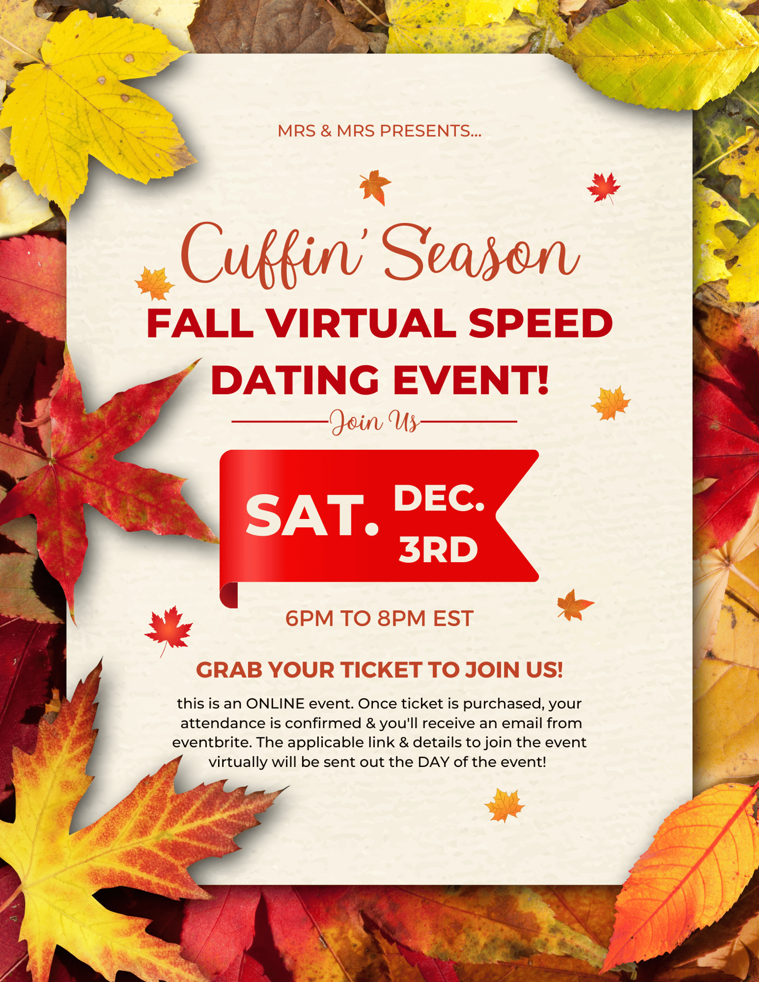 Mrs & Mrs presents our 5th Singles Mixer! It will take place Saturday, December 3rd from 6PM to 8PM EST.